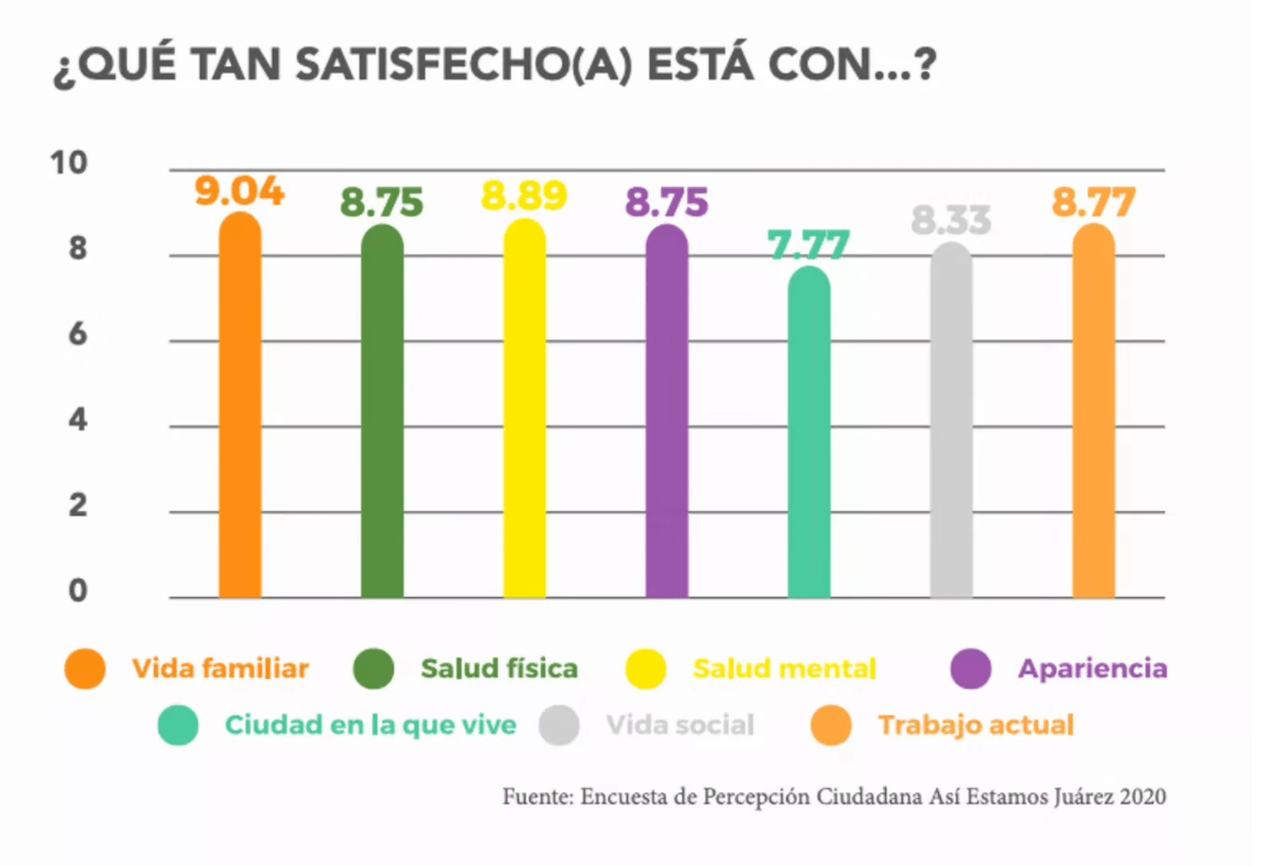 Ciudad Juárez, Chihuahua.— De acuerdo con el Informe Así Estamos Juárez 2021, de la asociación civil Plan Estratégico de Juárez, el 75.7 por ciento de la ciudadanía juarense nunca pensaron en irse de la ciudad durante 2020, lo que representa el mayor porcentaje de los últimos seis años. En cuanto a distritos electorales locales, es el 4 el que presenta un mayor porcentaje de personas con la misma respuesta, y, por otra parte, el 9 es el que menor porcentaje tiene, con 65.4 por ciento. Asimismo, sobre la pregunta “¿qué tanto cree que las personas estemos orgullosas de ser o vivir en Ciudad Juárez?”, la cifra asciende a 50.9 por ciento de personas que respondieron “muy orgullosas”. Es decir, casi 51 de cada 100 juarenses perciben mucho orgullo en la ciudadanía, que, no obstante, es una cifra muy por debajo del 63.8 por ciento al que se llegó en 2017. Al respecto, son el distrito 10 donde más orgullo se percibe, y los distritos 7 y 8 donde menos, con 65.2 y 47.1 por ciento, respectivamente. Ahora bien, sobre la felicidad de las y los juarenses, destaca que se promedió una calificación de 8.56 puntos de 10 disponibles, lo que representa la segunda cifra más alta de los últimos seis años, seis centésimas por debajo del 8.62 del año 2017. El distrito local con mayor calificación fue el 10, que promedió 8.60 puntos, y el de menor calificación fue el 3, con 8.35 puntos. En esta edición del informe se incluyeron más indicadores de bienestar subjetivo, como lo son la percepción de satisfacción de las y los habitantes de esta ciudad sobre su vida familiar, salud física, salud mental, apariencia, ciudad en que vive, vida social y trabajo actual. La ciudadanía expresó sentirse mayormente satisfecha con su vida familiar, y la calificó con 9.04 puntos de 10 posibles. Le siguen la salud mental, con 8.89; el trabajo actual, con 8.77; la salud física y la apariencia, con 8.75 puntos cada una; la vida social, con 8.33, y la ciudad en la que vive con 7.77 puntos, la única que se encuentra por debajo de los 8 puntos.