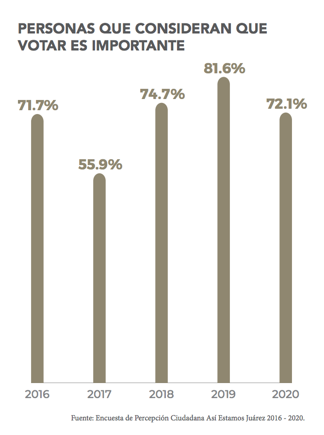 Ciudad Juárez, Chihuahua.— El porcentaje de juarenses que en 2020 consideraron que votar es importante tuvo una disminución significativa con respecto al año anterior, de acuerdo con el Informe Así Estamos Juárez, que presentó Plan Estratégico de Juárez; en 2020 el 72.1 por ciento de los juarenses opinó que votar es importante, mientras que en 2019 fue el 81.6. En 2018 la lista nominal en Juárez era de 1 millón 84 mil 514 personas, de acuerdo con información del Instituto Estatal Electoral de Chihuahua, y en la elección de Ayuntamiento de ese mismo año hubo una participación del 47.6 por ciento. Este domingo 6 de junio de 2021 se llevarán a cabo elecciones en todo México. En esta ocasión, se definirán la conformación de la Cámara de Diputados a nivel federal, y en el caso de Chihuahua también a nivel estatal, además de las presidencias municipales, las sindicaturas y la gubernatura. Para el Congreso del Estado de Chihuahua se elegirán 22 representantes por mayoría relativa y 11 de representación proporcional. Además, para Juárez se elegirá a quienes conformarán el Ayuntamiento 2021-2024, que constará de una persona titular de la Presidencia Municipal y su planilla de 11 Regidurías. El resto de estas, nueve más, serán repartidos por principio de representación proporcional. Además, se elegirá a la persona titular de la Sindicatura y una más para la Gubernatura. En 2018, se registró una participación, a nivel nacional, del 63.4 por ciento del listado para elegir titular de la Presidencia de la República. En Juárez ese año, el 47.6 por ciento de las personas en el listado nominal electoral participaron para elegir Ayuntamiento, y el 47.4 para elegir Sindicatura y diputaciones locales, de acuerdo con el Informe Así Estamos Juárez 2021.