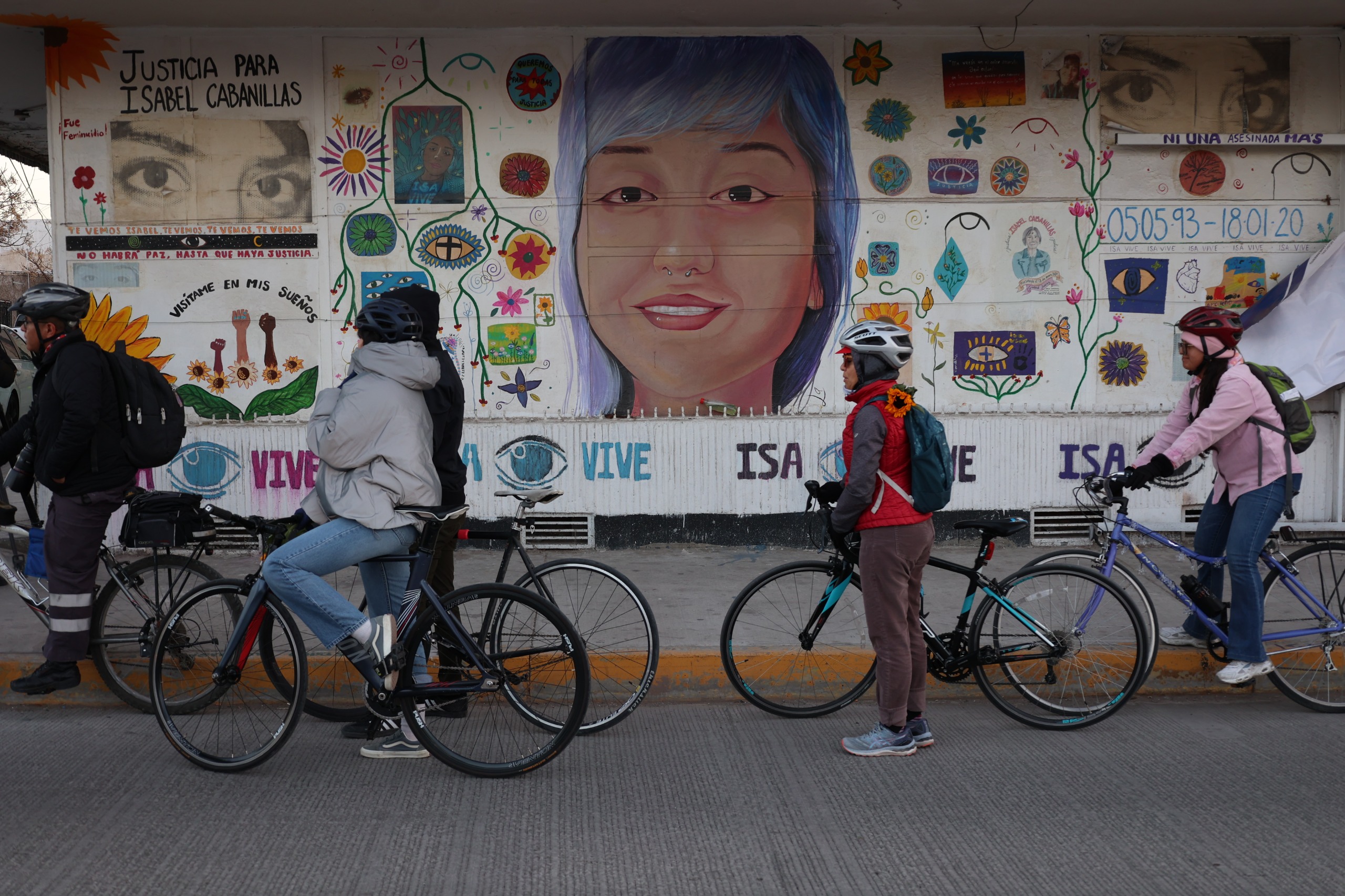 En el mural, la familia y amistades de Isabel esperaron a los ciclistas para dar inicio a la caminata que Reyna organiza año con año, para recrear a pie el último recorrido que hizo la artista antes de su asesinato. Ahí, la madre de Isabel repartió camisetas que tenían estampadas fotografías de la joven con su bicicleta.