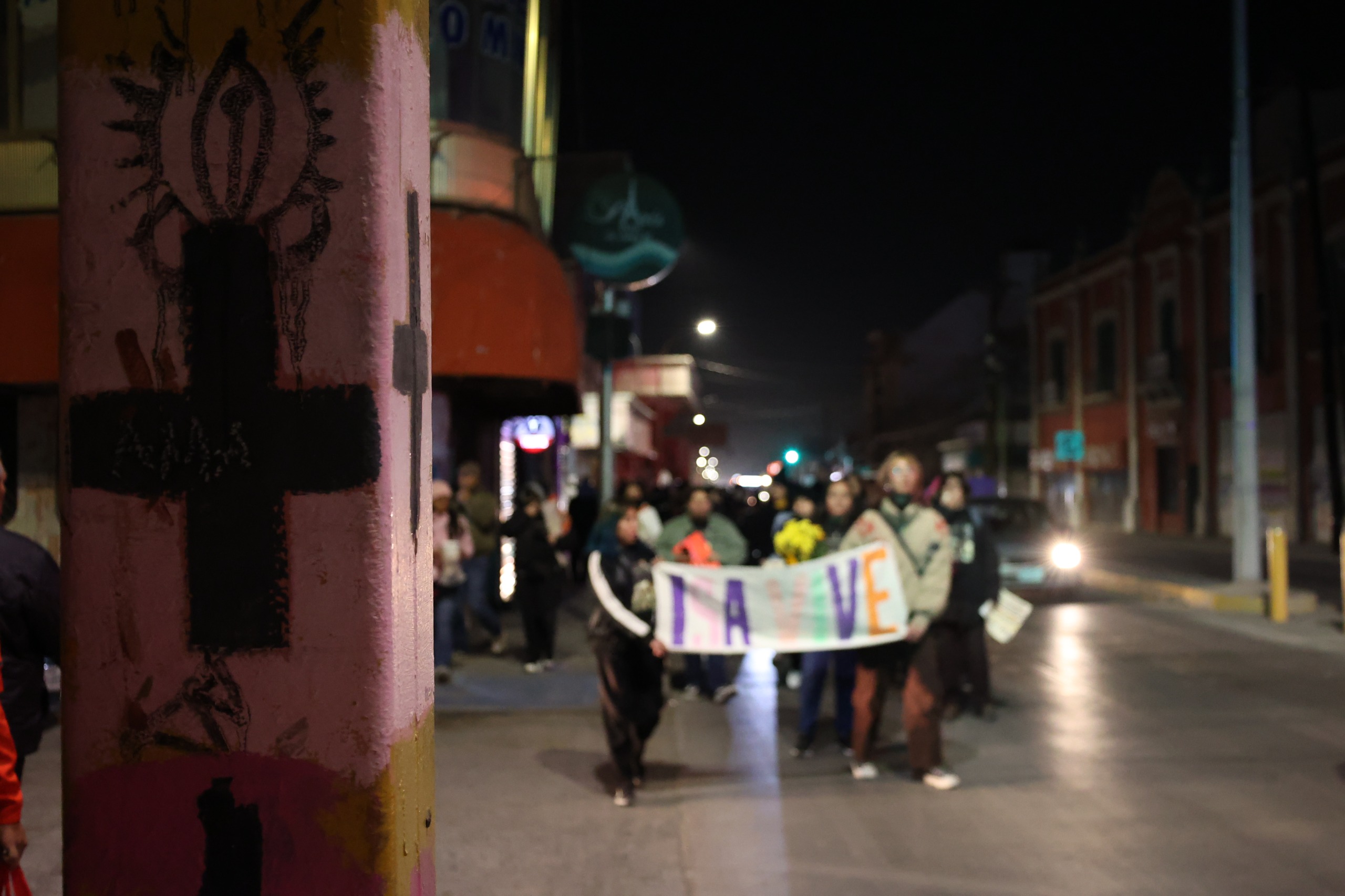 Tras unos minutos de estar ahí y mirar la fachada del edificio, Reyna retomó el recorrido sosteniéndose de la bicicleta de su hija, en medio de la oscuridad y el frío. Durante el trayecto se intervinieron las paredes con la técnica de paste up, pegando consignas y fotografías de Isabel.