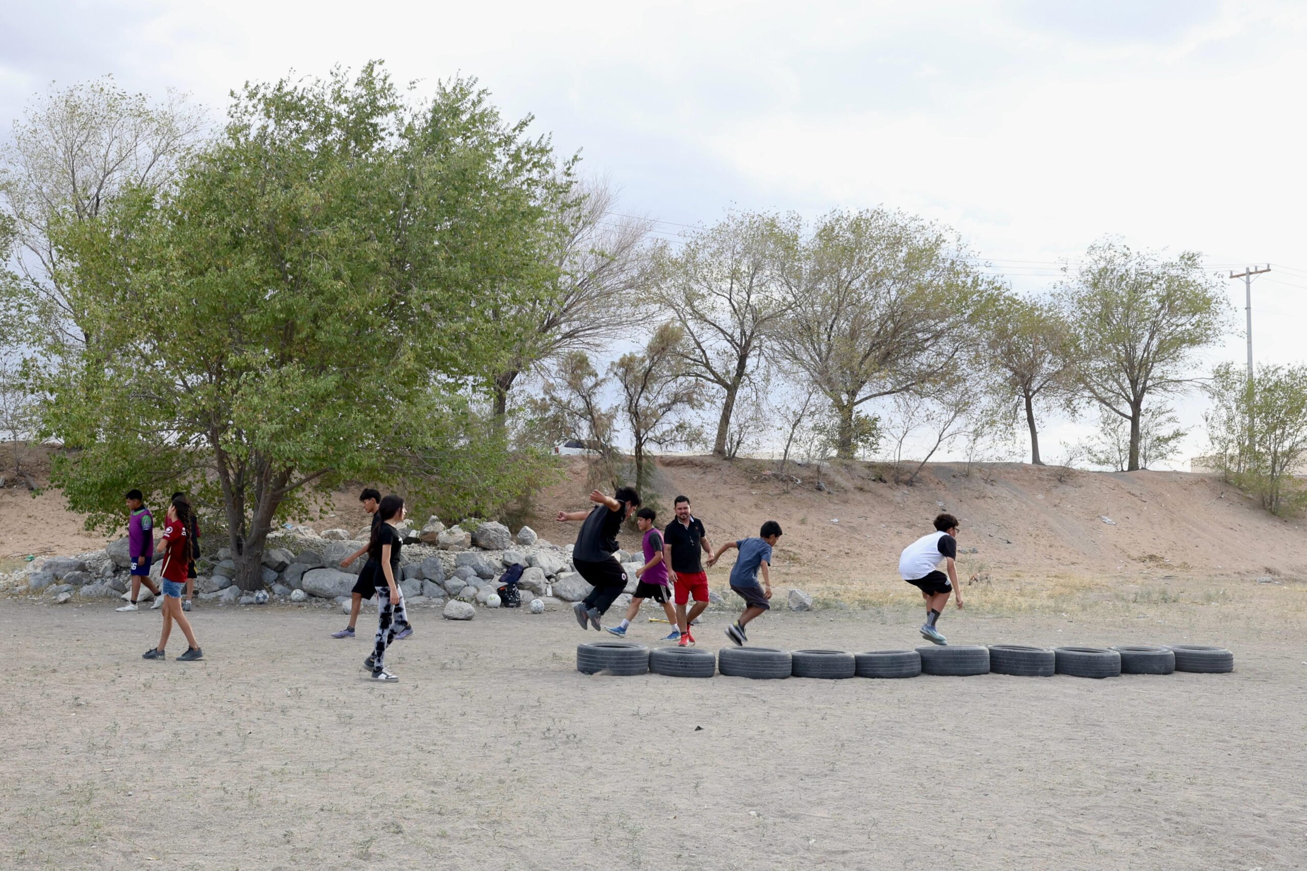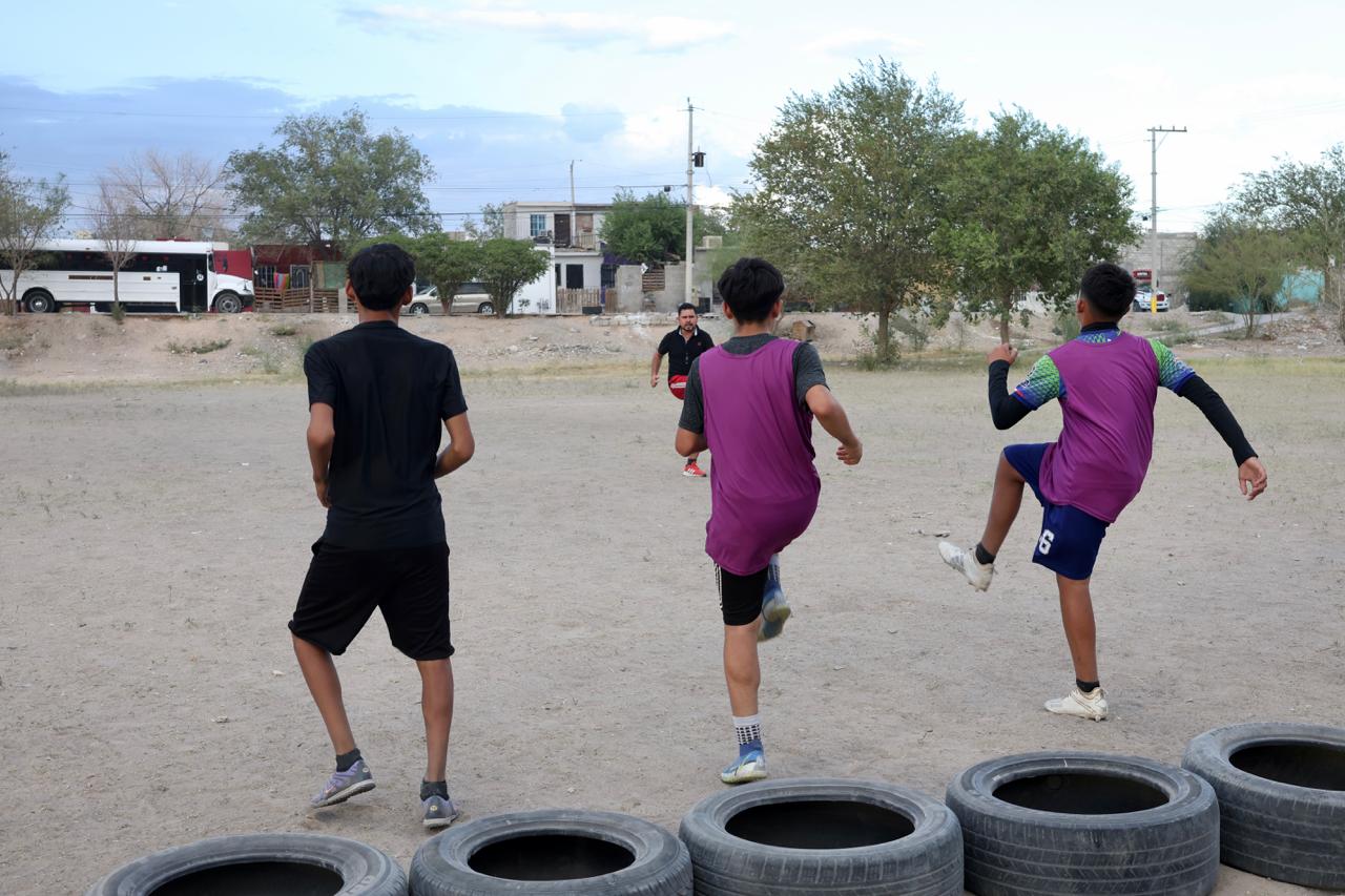 Ciudad Juárez, Chihuahua.— La falta de infraestructura para el deporte y la recreación en el suroriente de la ciudad ha llevado a sus habitantes a organizarse para resignificar el espacio público. Un ejemplo de ello es el vaso de captación ubicado en la calle Mar de Plata y Bahía Blanca, en la colonia Parajes del Sur, que se ha transformado en una cancha gestionada por la comunidad.