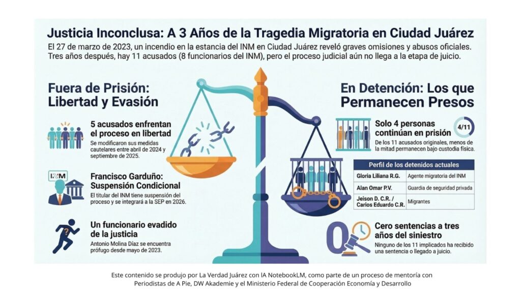 A 36 meses del incendio en la estancia provisional del Instituto Nacional de Migración (INM) en Ciudad Juárez, donde 40 migrantes perdieron la vida y 27 resultaron heridos, el proceso judicial se caracteriza por el estancamiento y la disparidad en el trato a los acusados. De las 11 personas identificadas como presuntas responsables de esta tragedia solo cuatro permanecen en la cárcel sin sentencia, el resto sigue su proceso en libertad