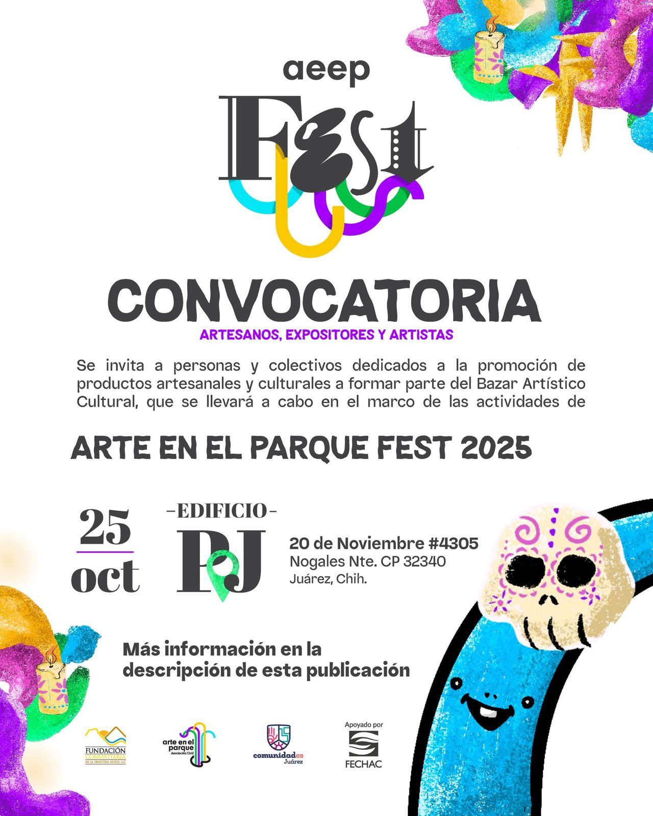 Ciudad Juárez, Chihuahua.– La asociación civil Arte en el Parque lanzó una convocatoria para que artesanos, artistas y expositores culturales formen parte del bazar artístico cultural del Arte en el Parque Fest 2025, que se celebrará el próximo sábado 25 de octubre en el edificio Participa Juárez.