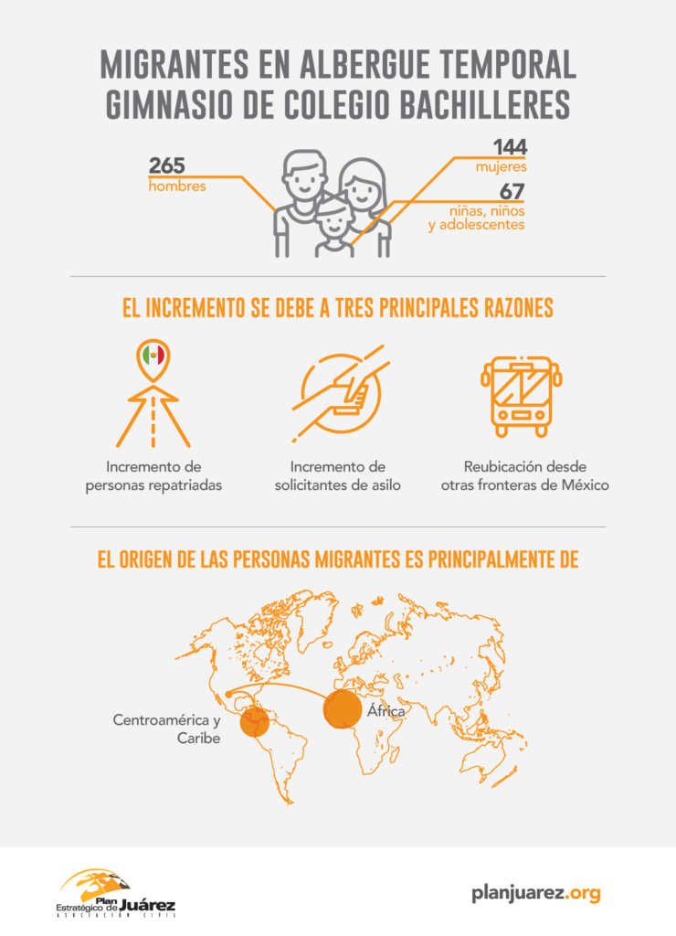 Aunado a la tasa en aumento de personas migrantes que llegan a Juárez, las políticas migratorias estrictas de los Estados Unidos ha hecho que la cifra de personas que logran el asilo político en ese país descendiera de 60 a 15 en los últimos meses. Pese a que se cuenta con el apoyo tanto de gobierno municipal, estatal y federal, Valenzuela instó a la ciudadanía a apoyar con alimentos no perecederos, artículos de higiene personal, platos, vasos y cubiertos desechables, bolsas de plástico y ropa. Los víveres son recibidos en la Subsecretaría de Desarrollo Social en esta ciudad, en las oficinas de la dependencia ubicadas en el Parque Central Poniente. Valenzuela advirtió que dado que ya se encuentran en el límite de aforo que puede tener el gimnasio, “tenemos que ponernos creativos para buscar cómo atender esta situación”.
