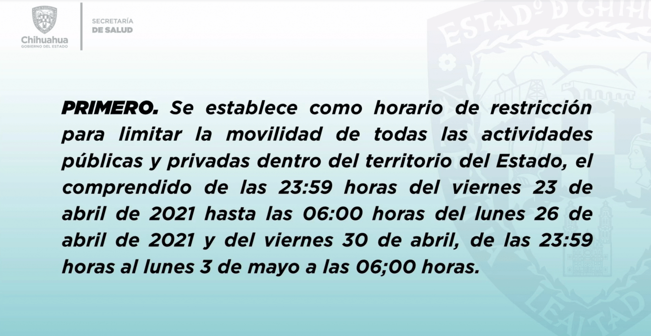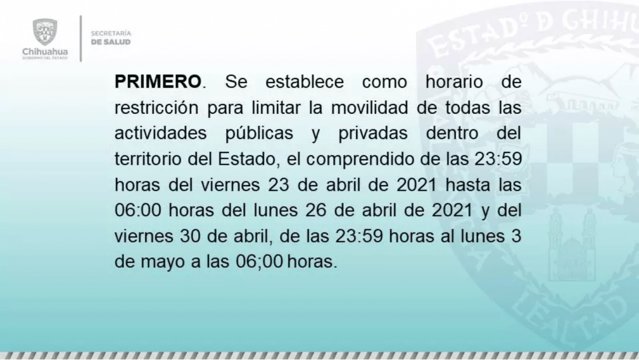 Esta medida fue tomada en consenso por el Consejo Estatal de Salud, y toma como referencia el cierre de actividades que se realizó en octubre del año pasado para contrarrestar el ascenso más alto que han tenido los contagios de COVID-19 en el estado desde el inicio de la pandemia, dijo. “Hoy se publica el decreto en el Diario Oficial del Estado. Este ejercicio ya lo hicimos en octubre y nos evitó llegar a la situación que llegó el país en diciembre. Pido, suplico, que hagamos el mismo esfuerzo que hicimos en octubre, vienen olas fuertes en el país”, mencionó el secretario de Salud. Chihuahua es el estado con la carga activa más alta de todo el país, y esto se refiere a la capacidad de contagio que tiene cada enfermo, el nivel de carga realmente es un dato que nos preocupa, la tendencia sigue al alza desde hace tres o cuatro quincenas, mencionó.