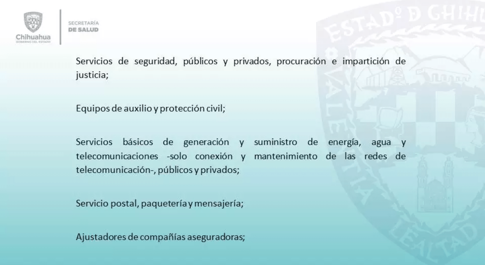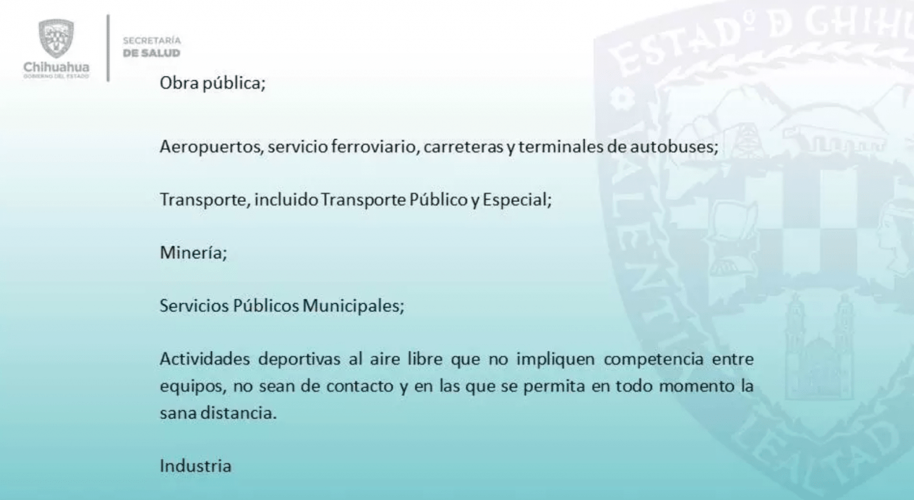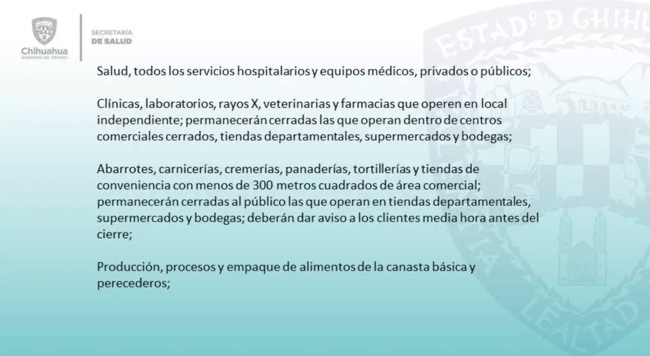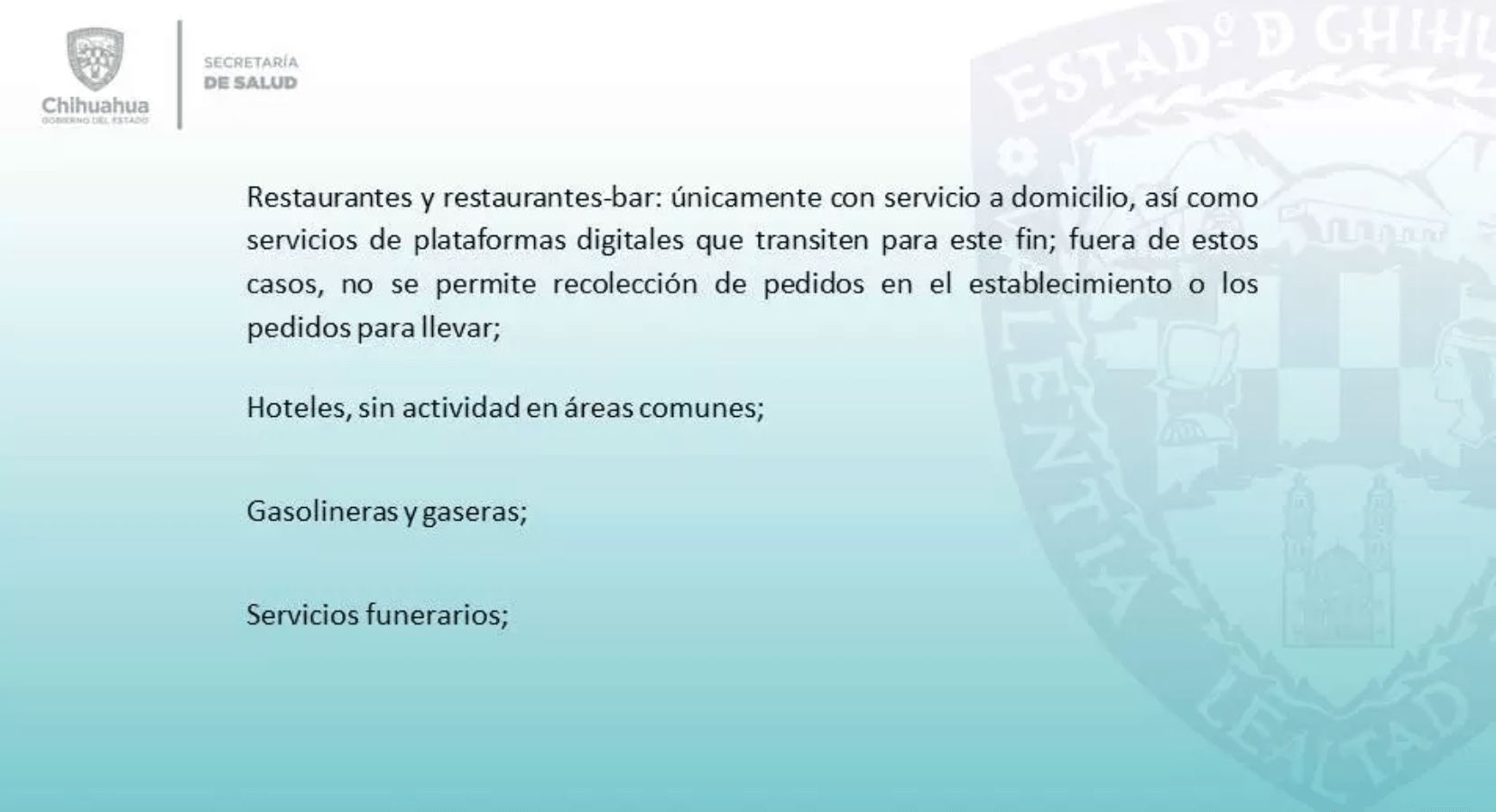 Podrán operar actividades relacionadas a la Salud, como son: todos los servicios hospitalarios y equipos médicos, privados o públicos, clínicas, laboratorios, rayos X, veterinarias y farmacias que operen en local independiente y tendrán que cerrar las que operen dentro de centros comerciales cerrados, tiendas departamentales, supermercados y bodegas. Abarrotes, carnicerías, cremerías, panaderías, tortillerías y tiendas de conveniencia con menos de 300 metros cuadrados de área comercial y tendrán que cerrar sus puertas al público las que operan en tiendas departamentales, supermercados y bodegas. De la misma forma, podrán operar la producción, procesos y empaques de alimentos de la canasta básica y alimentos perecederos. Quedarán activos los servicios de seguridad, públicos y privados, procuración e impartición de justicia, así como los equipos de auxilio y protección civil, los servicios básicos de generación y suministro de energía y agua. En el caso de los servicios de telecomunicaciones, sólo podrán dar servicio las áreas relacionadas a la conexión y mantenimiento de las redes de telecomunicación tanto de entes públicos como privados, además podrá trabajar el servicio postal, paquetería y mensajería, así como los ajustadores de compañías aseguradoras. Los restaurantes y restaurantes-bar podrán ofrecer únicamente servicio a domicilio, así como servicios de plataformas digitales que transiten para este fin y no podrán ofrecer pedidos para llevar. Los hoteles podrán estar abiertos sin actividad en áreas comunes. Podrán continuar activos los servicios como gasolineras y gaseras, servicios funerarios, obra pública, aeropuertos, servicio ferroviario, carreteras y terminales de autobuses, transporte, incluido transporte público y especial, minería y servicios Públicos Municipales así como la industria. Asimismo las actividades deportivas al aire libre que no impliquen competencia entre equipos, no sean de contacto y en las que se permita en todo momento la sana distancia podrán continuar durante los fines de semana.