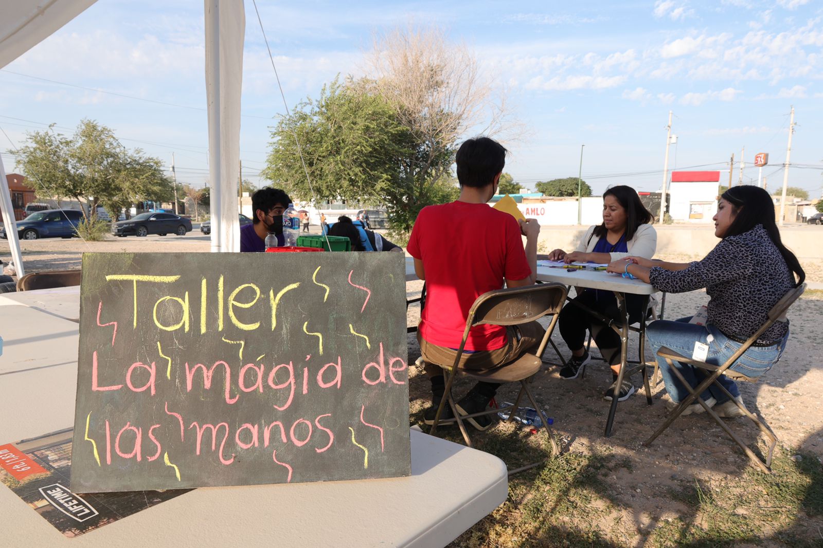 Ciudad Juárez, Chihuahua.— Niñas, niños y adolescentes participaron en cuatro talleres de arte y ciencia en la colonia Parajes de Oriente este viernes, en el marco de una jornada comunitaria que se llevó a cabo en el Parque de las Canchas.
