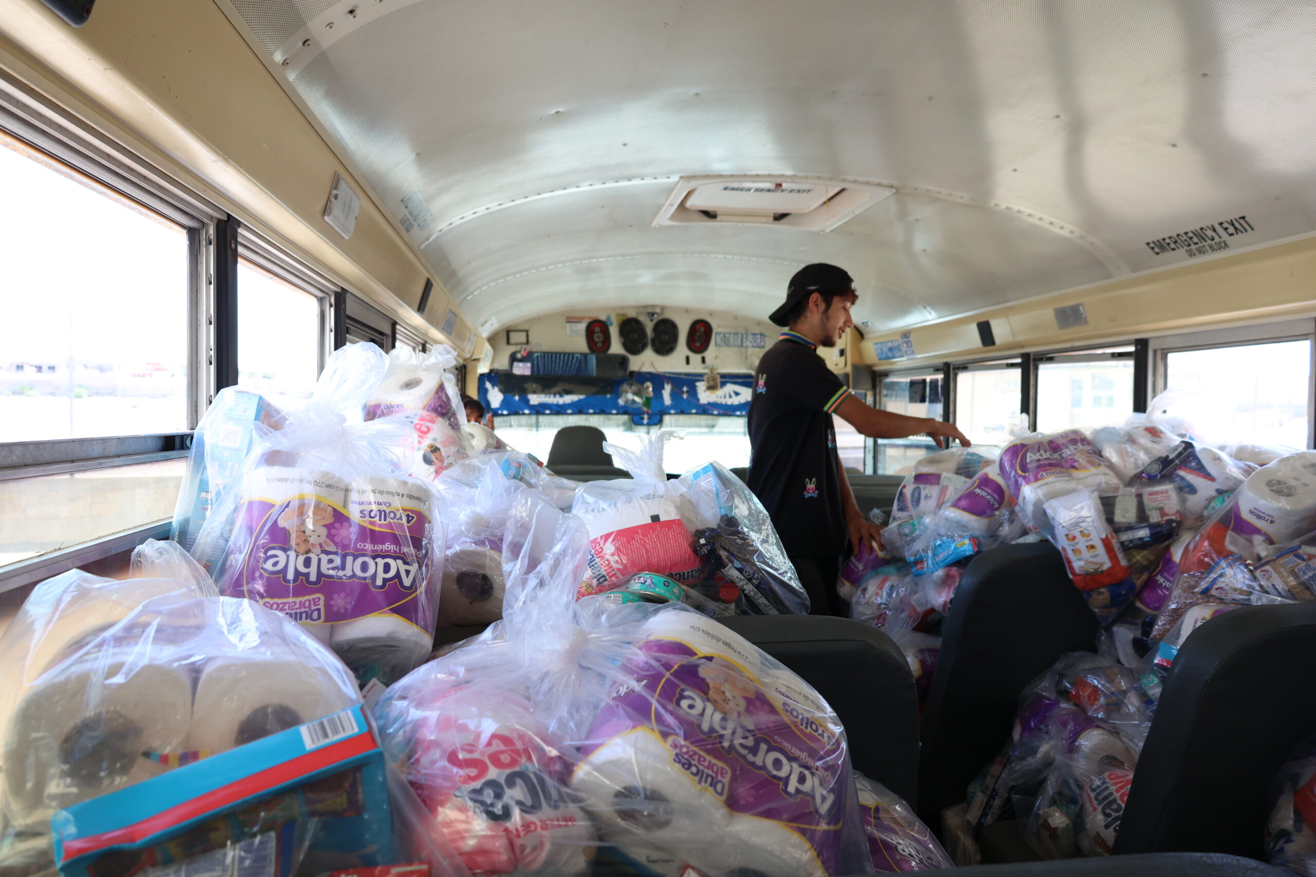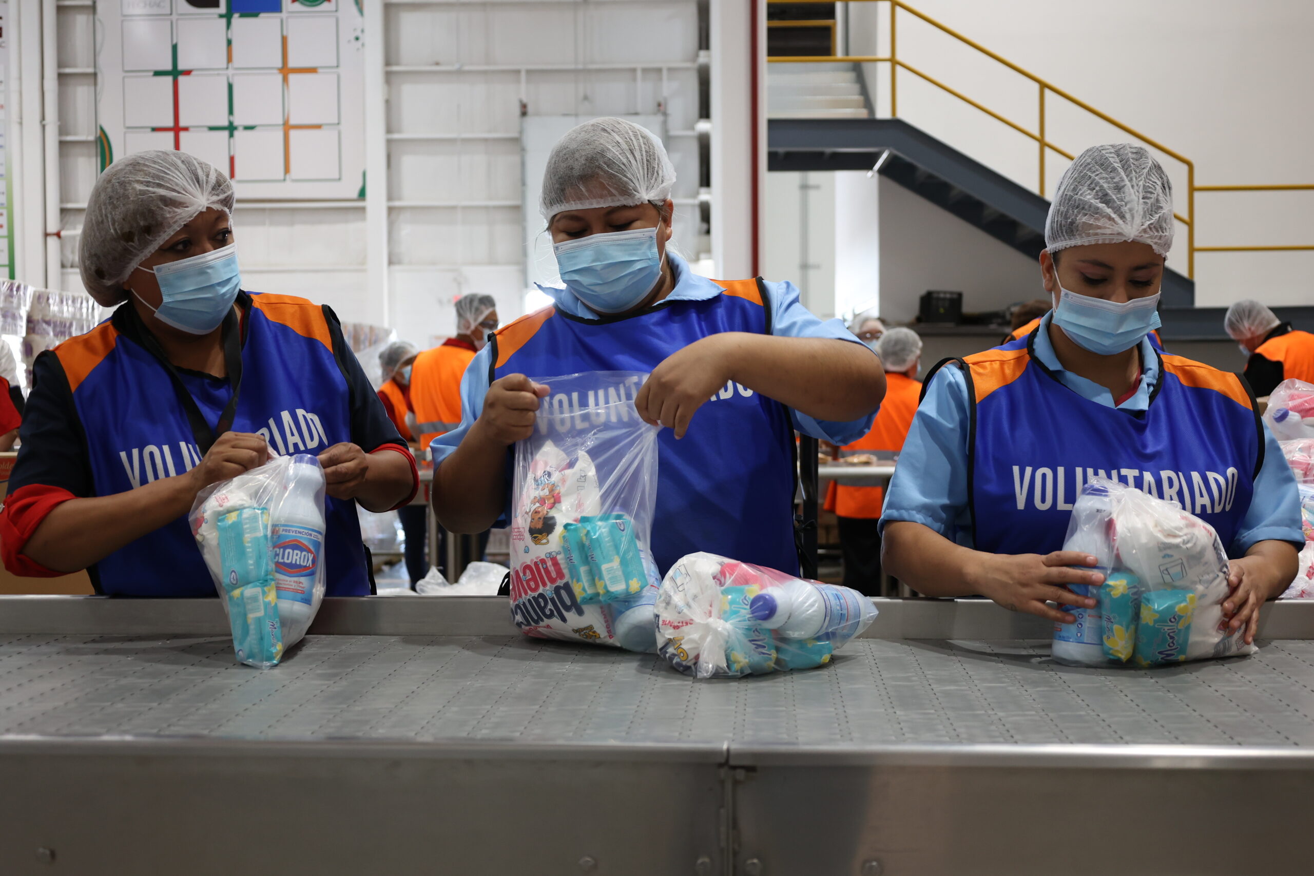 Ciudad Juárez, Chihuahua.— En una larga mesa metálica, dispuesta como una línea de producción, manos voluntarias comienzan a trabajar: embolsan diferentes productos, algunos de limpieza, otros enlatados, también arroz, frijol, galletas y cereal, todo en una bolsa grande que forma un paquete alimentario con las características nutricionales que necesita una persona.