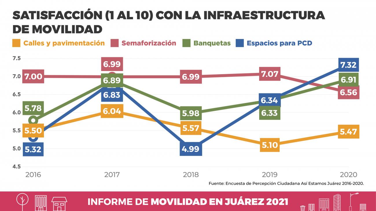 Ciudad Juárez, Chihuahua.— La pavimentación y el estado de las calles es la infraestructura pública peor valorada por los juarenses en 2020, de acuerdo con el Informe de Movilidad en Juárez 2021. El documento, presentado ayer por Plan Estratégico de Juárez (PEJ), muestra que los fronterizos calificaron con 5.47 de 10 puntos la satisfacción que les generó este tipo de infraestructura de movilidad. 2020 no ha sido el único año en que se ha evaluado negativamente la condición de las calles: de los últimos cinco años, sólo en 2017 hubo una calificación aprobatoria. El resto se registraron niveles por debajo de los 6 puntos. El informe, que desglosa las zonas donde la población se siente más insatisfecha con el estado de las calles, ubica al Distrito 2 como el menos satisfecho con una valoración de 4.42 puntos. A este le sigue el Distrito 3 con 4.82 puntos.