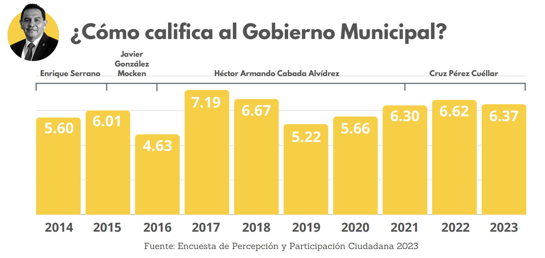 Las calificaciones ciudadanas otorgadas a Pérez Cuéllar desde 2021 superan a las de los últimos los años del exalcalde Armando Cabada, que fueron de 5.22 en 2019 y 5.66 en 2020.