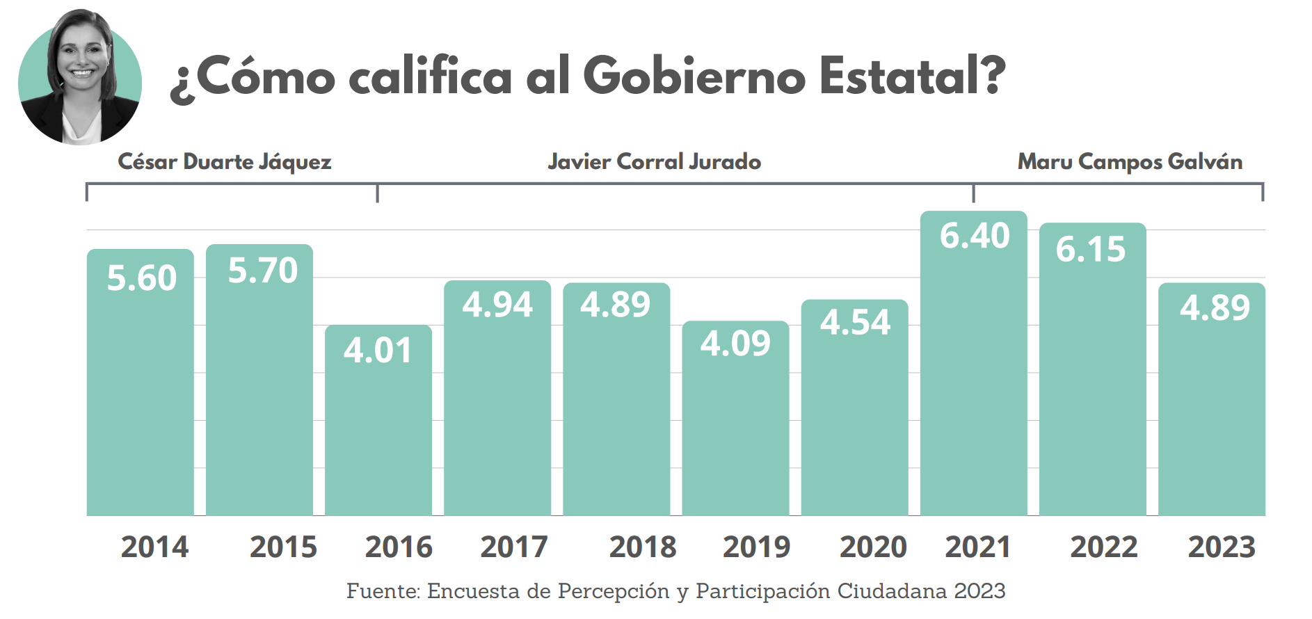 En 2021, al inicio de la administración de Campos Galván, la calificación ciudadana al gobierno estatal era de 6.40, cayendo a 6.15 en 2022 y finalmente a 4.89 el año pasado.