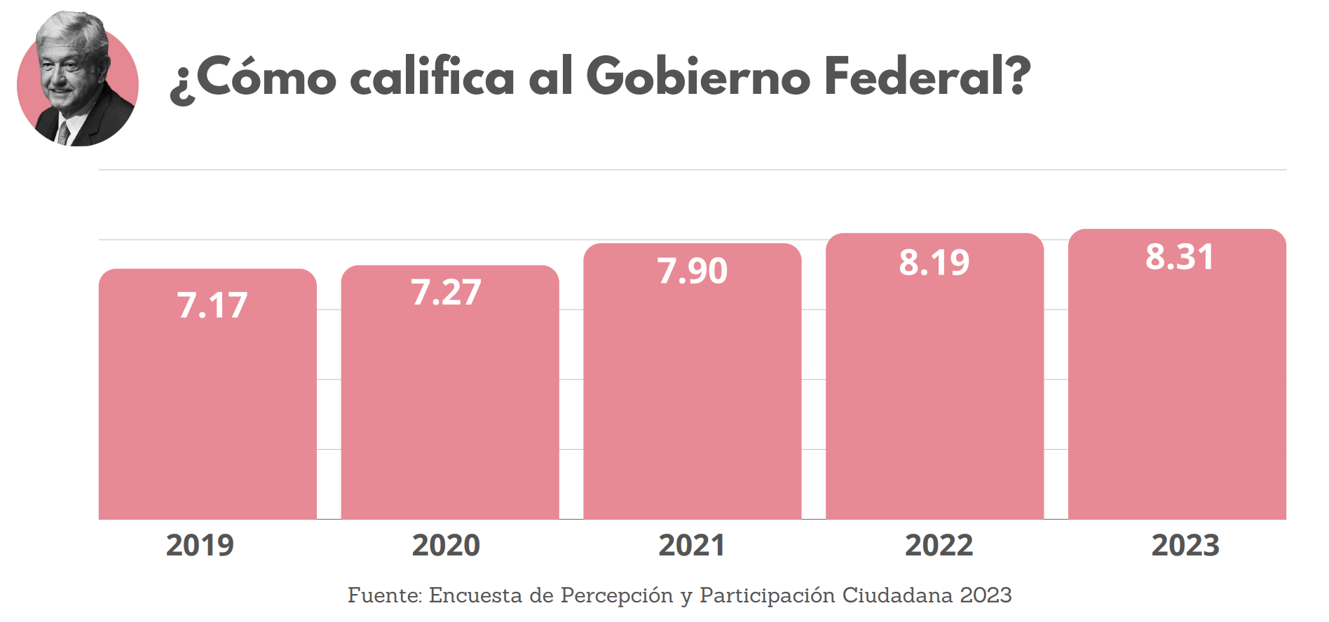 En el caso del gobierno federal, encabezado por el presidente Andrés Manuel López Obrador (Morena), la calificación otorgada por las y los juarenses llegó a 8.31 el año pasado.