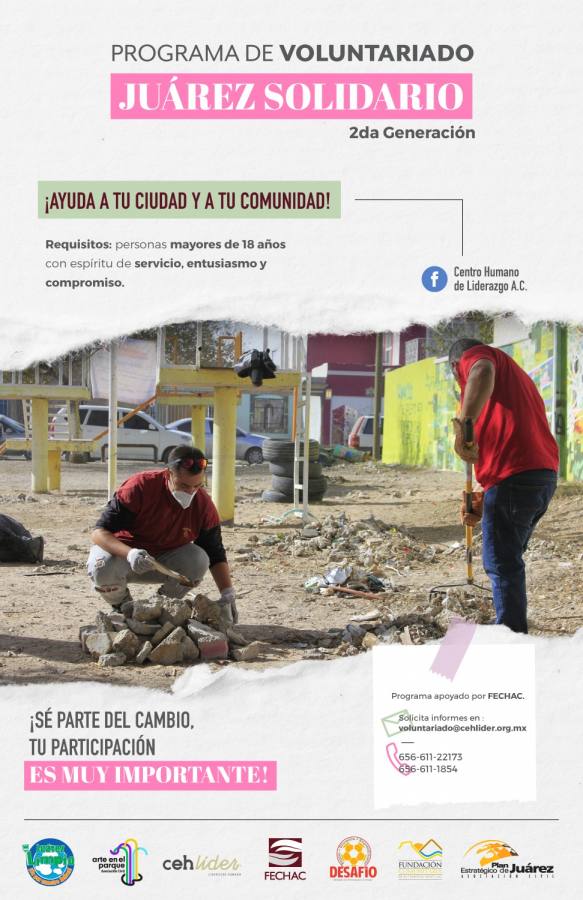 Ciudad Juárez, Chihuahua.— El Centro Humanos de Liderazgo A.C. (Cehlíder) tiene abierta su convocatoria a la ciudadanía que desee ingresar a la segunda generación del programa de voluntariado Juárez Solidario. El proceso de capacitación de voluntariado consiste en ocho horas de formación divididas en cuatro módulos en donde se verán temas como desarrollo de equipos, cultura de la colaboración, cultura solidaria y resolución de problemas para las comunidades, comentó Jonathan Morales, coordinador del programa de voluntariado. La dirección ejecutiva de la organización informó que a lo largo de 2022 se formarán cuatro generaciones de voluntarios, quienes apoyarán en diversas actividades enmarcadas dentro del proyecto comunitario ‘Comunidades Juárez’, en el suroriente de la ciudad. Se dio a conocer que las personas que se sumen a Juárez Solidario podrán colaborar con asociaciones como Juárez Limpio, Arte en el Parque, Fundación Comunitaria de la Frontera Norte y la Red de Vecinos de Plan Estratégico de Juárez. Los requisitos para las personas interesadas son “personas mayores de 18 años con espíritu de servicio, entusiasmo y compromiso” y responder al formulario que se encuentra disponible en la página de Facebook de Cehlíder. Las y los interesados pueden comunicarse al (656) 611 1854 y al correo voluntariado@cehlider.org.mx Durante el mes de diciembre, la primera generación de voluntarios del programa Juárez Solidario participó en una jornada de mejoramiento urbano en el parque Desierto de Libia en el fraccionamiento Parajes de Oriente. Esta actividad consistió en limpiar y pintar el parque con ayuda de los vecinos del fraccionamiento y fue organizada por Juárez Limpio A.C.