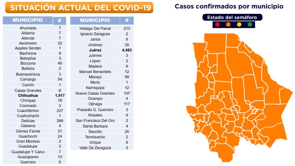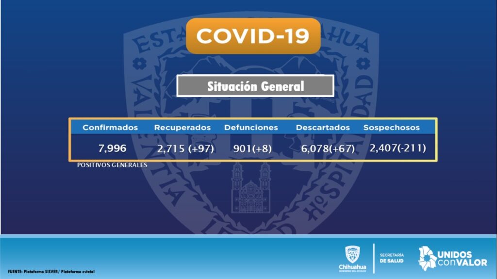 Ciudad Juárez, Chihuahua.— Al último corte informativo sobre la situación de COVID-19 en el estado, la Secretaría de Salud indicó que suman 7 mil 996 contagios confirmados y 901 muertes. De acuerdo con el director médico de la Zona Norte, Arturo Valenzuela Zorrilla, en 24 horas se agregaron 55 casos confirmados y cuatro muertes en Juárez. En el municipio de Juárez hay un total de 4 mil 483 casos positivos acumulados, mientras que en Chihuahua suman mil 898, explicó el director médico. El resto de los casos confirmados se distribuye de la siguiente manera: 8 en Bachíniva, 227 en Cuauhtémoc, 116 en Ojinaga, 12 en Namiquipa, 99 a Meoqui, 3 Julimes, 54 en Camargo, 26 en Saucillo, 7 Ahumada, 3 en Guadalupe D. B., 24 en Guachochi, 399 en Delicias, 32 Ascensión, 6 Guerrero, 46 en Bocoyna, 6 en Madera, 213 en Parral, 3 en Buenaventura, 2 en Temósachi, 4 en Galeana, 7 en Guadalupe y Calvo, 107 en Nuevo Casas Grandes, 9 en Rosales, 39 en Jiménez, 7 en Aldama, 4 en Santa Bárbara, 2 en Ignacio Zaragoza, 2 en López, 9 en Urique, 9 Janos, 2 San Francisco del Oro, 10 Guazapares, 6 Allende, 3 Coronado, 3 en Valle de Zaragoza, 6 Casas Grandes, 1 Moris, 31 Gómez Farías, 3 Praxedis G. Guerrero, 4 Ocampo, 2 Balleza, 18 Chínipas, 1 Cusihuiriachi, 2 Gran Morelos, 1 Aquiles Serdán, 11 en Manuel Benavides, 3 Batopilas y 1 Carichí. Respecto a las defunciones por municipio de residencia, se distribuyen de la siguiente manera: 655 en Ciudad Juárez, 135 en Chihuahua, 17 en Cuauhtémoc, 2 en Guadalupe D. B., 5 en Ascensión, 4 en Camargo, 2 en Rosales, 1 en Bachíniva, 14 en Meoqui, 1 Buenaventura, 26 Delicias, 1 Ignacio Zaragoza, 1 San Francisco del Oro, 7 Parral, 1 Madera, 2 Coronado, 9 Nuevo Casas Grandes, 1 Ojinaga, 1 Valle de Zaragoza, 1 Bocoyna, 4 Saucillo, 1 Moris, 1 Gómez Farías, 1 Jiménez, 1 Urique, 1 Casas Grandes, 1 Allende, 1 Janos, 2 Galeana, 1 Ocampo y 1 Aquiles Serdán.