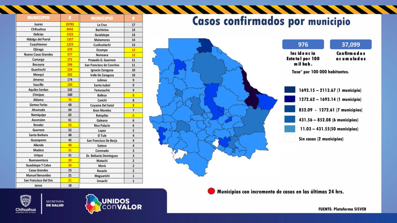 Los contagios por municipio se dividen de la siguiente manera: Ahumada 64, Aldama 76, Allende 40, Ascensión 61, Aquiles Serdán 142, Bachíniva 14, Batopilas 6, Bocoyna 246, Balleza 8, Buenaventura 30, Camargo 272, Carichí 8, Casas Grandes 23, Chihuahua 8 mil 443, Chínipas 100, Coronado 3, Coyame del Sotol 8, Cuauhtémoc 1 mil 223, Cusihuiriachi 13, Delicias 1,523, Dr. Belisario Domínguez 3, Galeana 6, Gómez Farías 68, Guachochi 224, Gran Morelos 7, Guadalupe 14, Guadalupe y Calvo 26, Guazapares 42, Guerrero 52, Parral 1 mil 357, Ignacio Zaragoza 10, Janos 18, Jiménez 174, Juárez 20 mil 783, Julimes 9, López 5, Madera 30, Manuel Benavides 21, Matachí 2, Meoqui 202, Moris 2, Namiquipa 62, Nuevo Casas Grandes 577, Ocampo 13, Ojinaga 670, Praxedis G. Guerrero 11, Riva Palacio 6, Rosales 53, Rosario 2, San Francisco del Oro 21, Santa Bárbara 48, Satevo 4, Saucillo 151, Temósachi 9, Urique 31, Valle de Zaragoza 10, San Francisco de Conchos 11, Santa Isabel 9, En La Cruz 17, San Francisco de Borja 4, Maguarichi 1, Nonoava 12, El Tule 4, Matamoros 14 y Uruachi 1.
