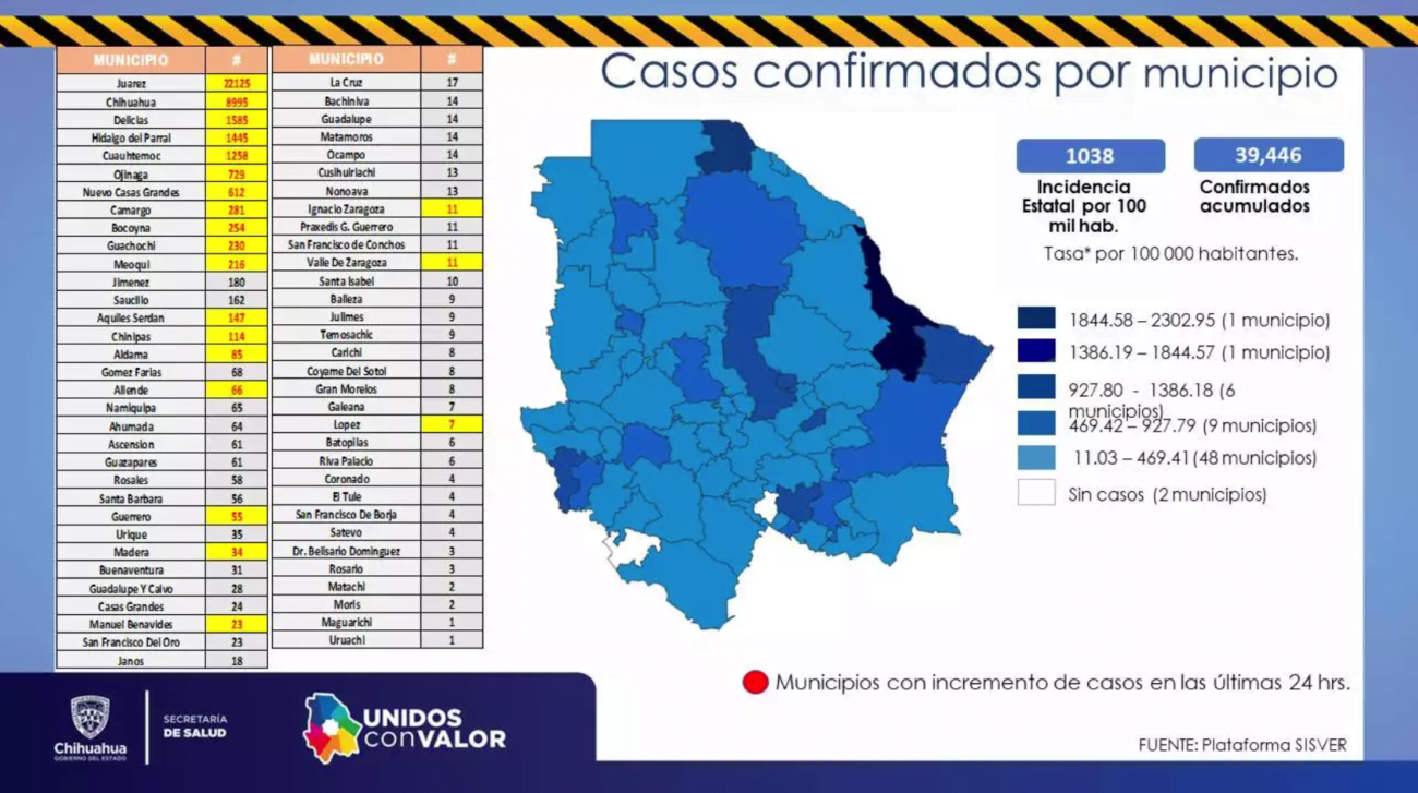 Los contagios confirmados por municipio se dividen de esta manera: Ahumada 64, Aldama 85, Allende 66, Ascensión 62, Aquiles Serdán 147, Bachíniva 14, Batopilas 6, Bocoyna 254, Balleza 9, Buenaventura 31, Camargo 281, Carichí 8, Casas Grandes 24, Chihuahua 8 mil 995, Chínipas 114, Coronado 4, Coyame del Sotol 8, Cuauhtémoc 1 mil 258, Cusihuiriachi 13, Delicias 1 mil 585, Dr. Belisario Domínguez 3, Galeana 7, Gómez Farías 68, Guachochi 230, Gran Morelos 8, Guadalupe 14, Guadalupe y Calvo 28, Guazapares 61, Guerrero 55, Hidalgo del Parral 1 mil 445, Ignacio Zaragoza 11, Janos 18, Jiménez 180, Juárez 22 mil 125, Julimes 9, López 7, Madera 34, Manuel Benavides 23, Matachí 2, Meoqui 216, Moris 2, Namiquipa 65, Nuevo Casas Grandes 612, Ocampo 14, Ojinaga 729, Praxedis G. Guerrero 11, Riva Palacio 6, Rosales 58, Rosario 3, San Francisco del Oro 23, Santa Bárbara 56, Satevó 4, Saucillo 162, Temósachic 9, Urique 35, Valle de Zaragoza 11, San Francisco de Conchos 11, Santa Isabel 10, La Cruz 17, San Francisco de Borja 4, Maguarichi 1, Nonoava 13, El Tule 4, Matamoros 14 y Uruachi 1.