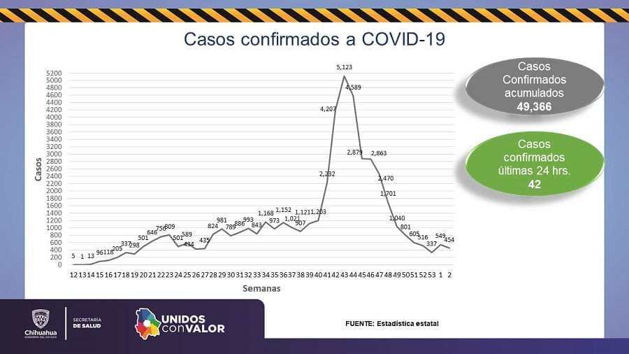 Ciudad Juárez, Chihuahua.— La Secretaría de Salud estatal informó que en el último día se confirmaron 42 nuevos casos de COVID-19 y cuatro fallecimientos a causa de la enfermedad en Chihuahua, con lo que la entidad ya acumula un total de 49 mil 366 contagios confirmados y 4 mil 614 muertes desde el inicio de la pandemia. De los 42 nuevos casos, 17 corresponden a Juárez, que hasta el momento se mantiene como el municipio chihuahuense más afectado por la enfermedad, con 27 mil 454 confirmados y 2 mil 517 muertes. En cuanto a la ocupación hospitalaria se informó que tres hospitales del estado están al 100 por ciento: el Hospital del Issste en Juárez, el Hospital Lázaro Cárdenas en Chihuahua y el Hospital General de Delicias. El resto se encuentra al 75 por ciento. El director médico de la Zona Norte, Arturo Valenzuela Zorrilla, indicó que hasta el momento se contabilizan 35 mil 228 personas recuperadas, 27 mil 515 casos descartados y mil 646 sospechosos. Hasta el momento se tienen 311 pacientes hospitalizados, de los cuales 71 permanecen intubados.