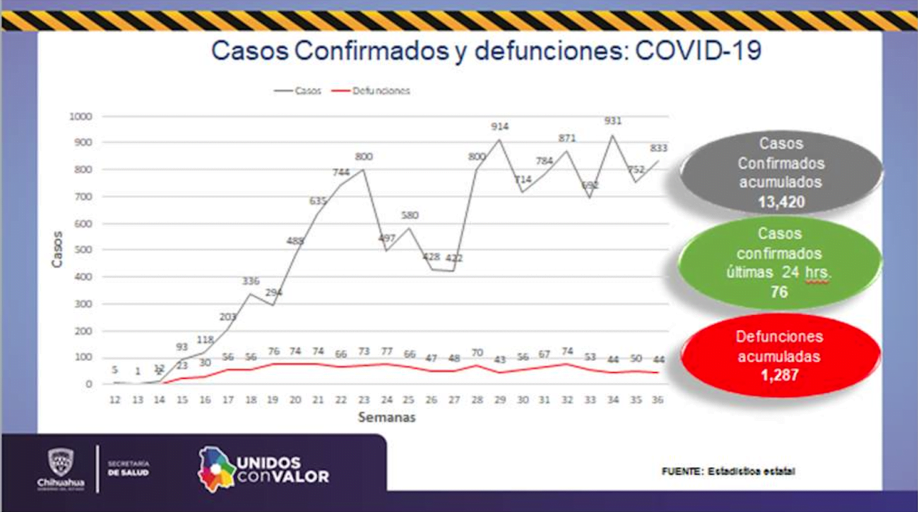 Ciudad Juárez, Chihuahua.— De acuerdo con el último corte informativo de la Secretaría de Salud hasta hoy van 13 mil 420 casos confirmados de COVID-19 en el estado mientras que las personas fallecidas llegaron a mil 287. En las últimas 24 horas se registraron 10 defunciones en el estado, dos en Juárez, cuatro en Chihuahua, tres en Cuauhtémoc y una en Aldama, de acuerdo con el director médico de la Zona Norte, Arturo Valenzuela Zorrilla.