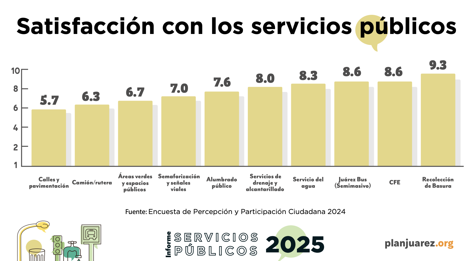 Ciudad Juárez, Chihuahua.— De acuerdo con el Informe de Servicios Públicos 2025 presentado ayer por la asociación civil Plan Estratégico de Juárez (PEJ), el servicio peor evaluado históricamente por la ciudadanía son las calles y la pavimentación, con una calificación reprobatoria de 5.7 de 10 posibles en 2024.