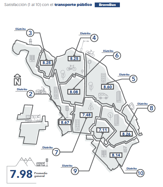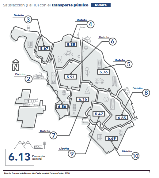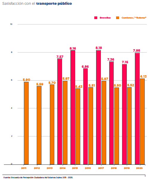 Ciudad Juárez, Chihuahua.— Luego de nueve años de que el servicio de transporte público tradicional (conocido como “ruteras”) se mantuviera con calificaciones por debajo de los 6 puntos de 10 disponibles, en 2020 el servicio registró un grado de satisfacción ciudadana de 6.13, lo que representa la mejor evaluación en 10 años. Pese a esta mejora, la satisfacción ciudadana aún está en niveles muy bajos, sobre todo en comparación con el servicio de transporte semimasivo (Vivebús/Ecobús/Bravobús), que en 2020 registró 7.98 puntos. Este tipo de transporte había registrado bajas los dos años anteriores, aunque luego se recuperó.