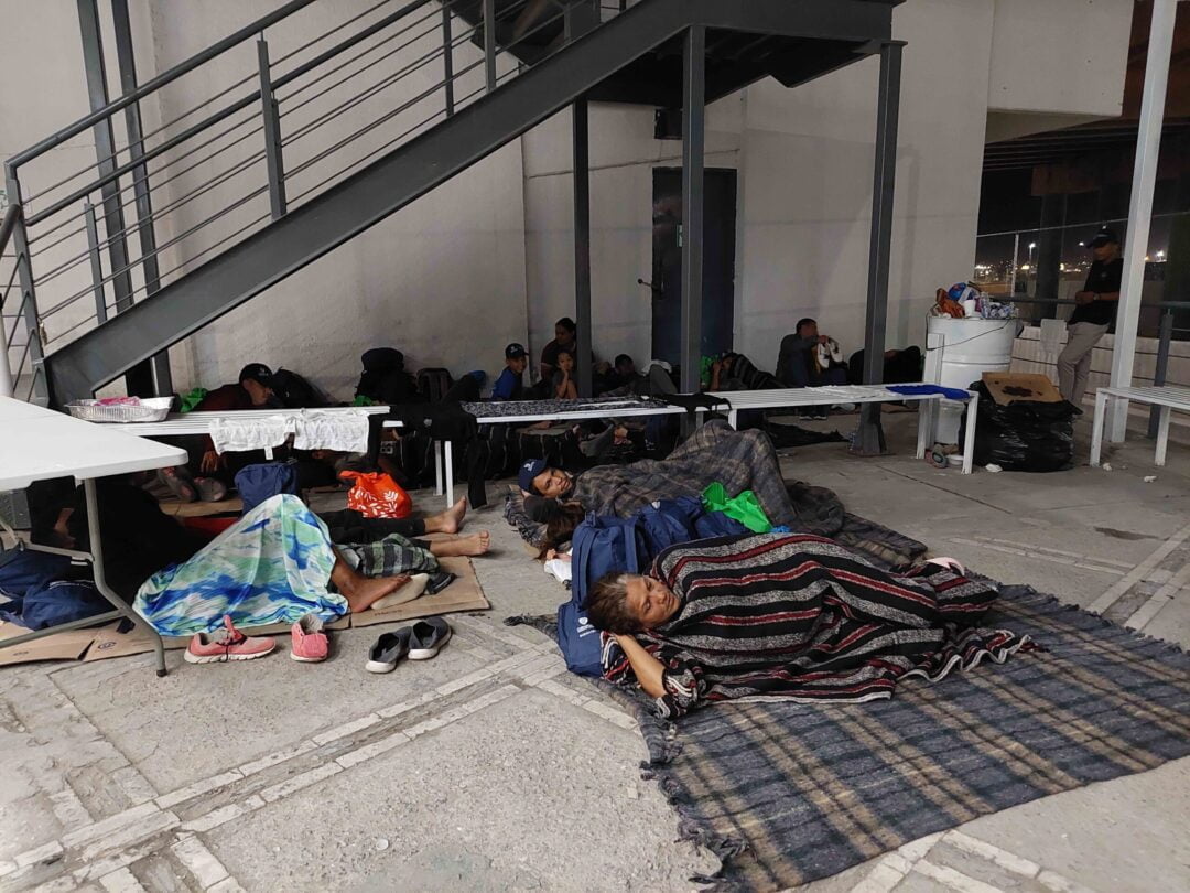 Algunos usan sus mochilas y chamarras como cobertores y cobijas para no recostarse en el piso frio, por el clima que se registra en la región en esta época de otoño. Los albergues para migrantes en la ciudad están saturados.