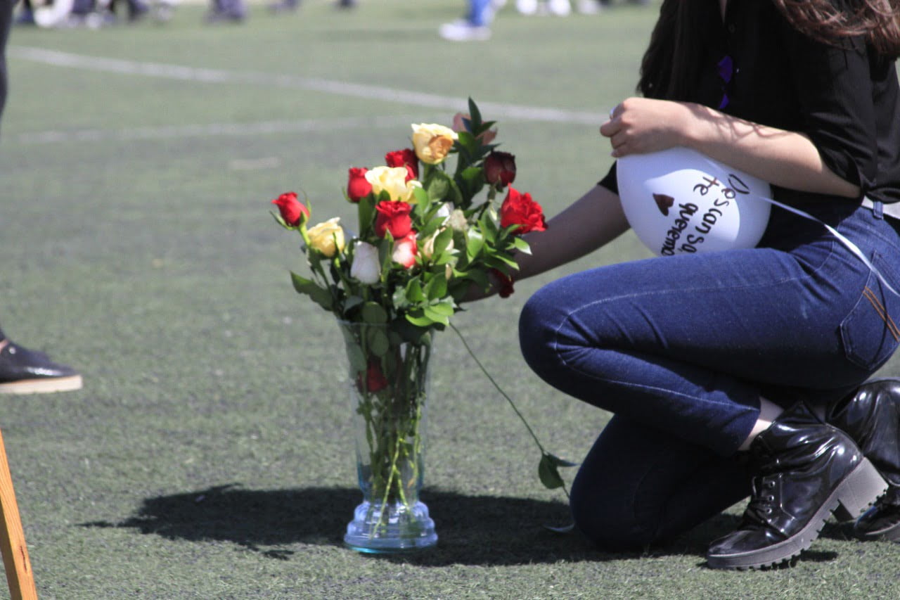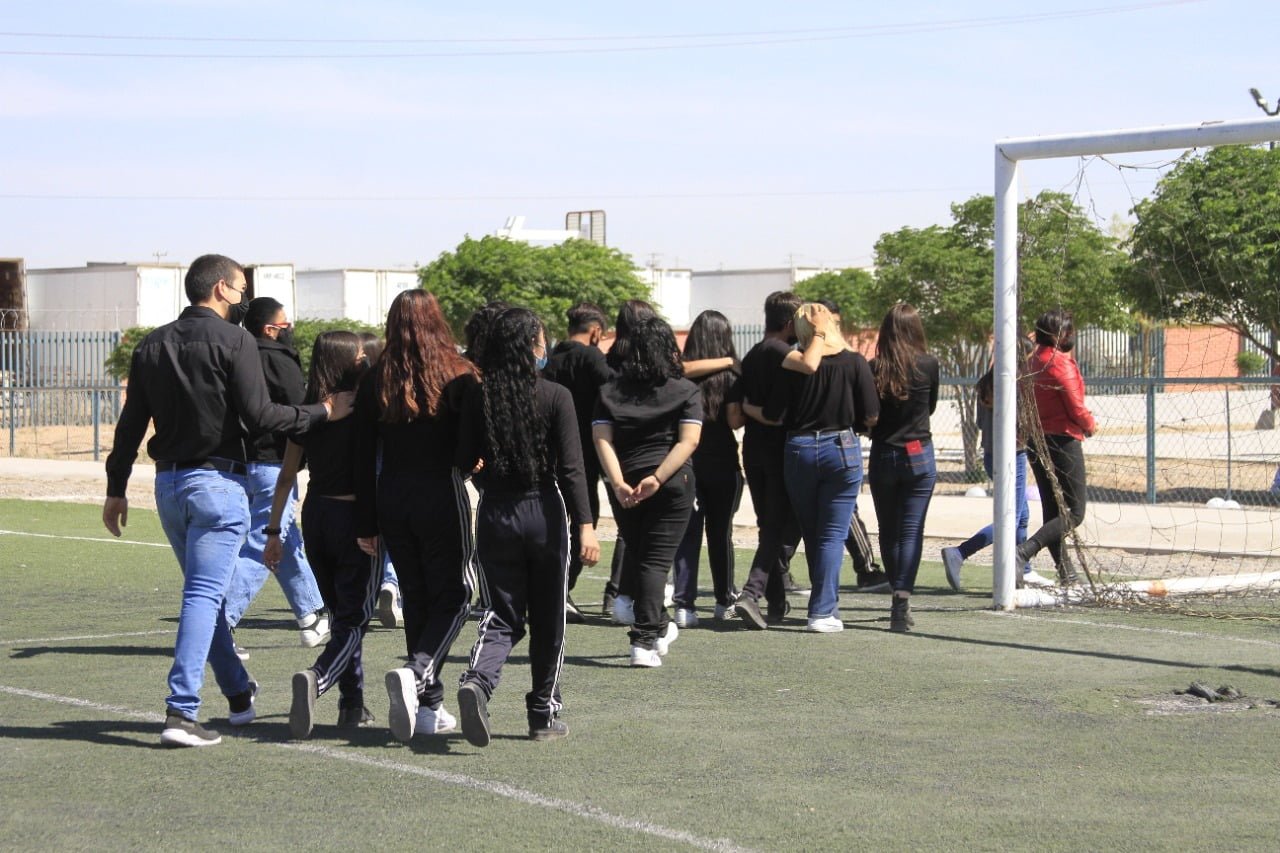 Ciudad Juárez, Chihuahua.— Con un acto conmemorativo en el Centro de Bachillerato Tecnológico Industrial y Servicios (CBTis) 270, compañeras y compañeros de Jessenia Johana le rindieron homenaje y le dieron el último adiós. El acto conmemorativo fue organizado por el grupo de sexto semestre al que pertenecía Jessenia Johana y, en un gesto de solidaridad, acudió todo el plantel educativo al campo de fútbol para despedirla. Las y los estudiantes acudieron con vestimenta blanca, mientras que el grupo organizador vistió de negro en señal de luto, así como con listones blancos y morados. Con silencio y respeto, todos los integrantes del plantel educativo escucharon el pase de lista del grupo al que perteneció Jessenia.