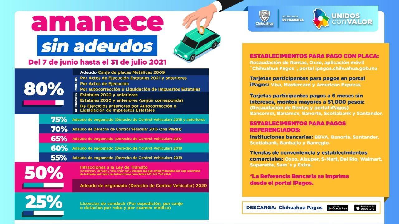 Ciudad Juárez, Chihuahua.— El próximo 31 de julio concluye el programa “Amanece sin adeudos” del Gobierno del Estado con el que la población puede aprovechar descuentos en multas y adeudos de trámites realizados en Recaudación de Rentas. En adeudos de Canje de placas metálicas del 2009 pueden obtener 80 por ciento de descuento, ya sea por multas o recargos. Sobre los adeudos de engomados (Derecho de Control Vehicular) del 2015 o años anteriores hay descuentos del 75 por ciento; cada año, hasta llegar al 2019, disminuye en cinco por ciento el descuento. Para las licencias de conducir, por expedición, canje, robo y examen médico, pueden obtener descuento del 25 por ciento, de acuerdo con la información proporcionada por la Secretaría de Hacienda. La ciudadanía puede pagar en los módulos de Recaudación de Rentas, ubicadas en las oficinas de Gobierno del Estado (Pueblito Mexicano) y para pago con placa, pueden acudir en las tiendas Oxxo, hacerlo a través de la aplicación móvil “Chihuahua pagos” o en el portal pagos.chihuahua.gob.mx. Únicamente se podrá pagar con las tarjetas Visa, Mastercard y American Express, en el portal iPagos. Quienes tengan que pagar con tarjeta a seis meses sin intereses a partir de montos mayores a mil pesos, solo lo podrán hacer con Banamex, Bancomer, Banorte, Scotiabank y Santander, en Recaudación de Rentas y el portal. En los bancos BBVA, Banorte, Santander, Scotiabank, Banbajío y Banregio se podrán realizar pagos referenciados. En los establecimientos comerciales, S-mart, Del Río, Walmart, Superette, Sam’s y Extra, también se podrá liquidar. Para ello deberán imprimir la referencia bancaria desde el portal de iPagos para que tanto en los bancos y establecimientos se pueda efectuar el pago.