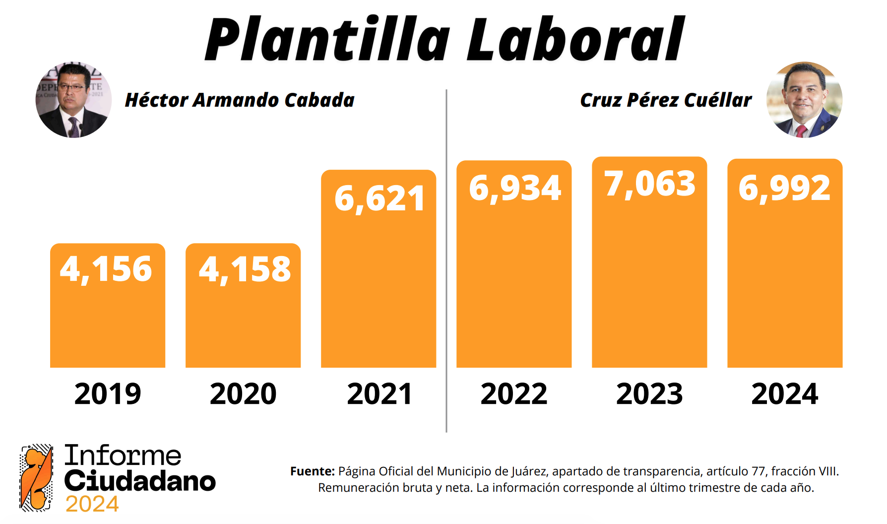 De acuerdo con información reportada por el gobierno municipal en su sección de Transparencia, entre julio y septiembre de 2021 (el último trimestre de Armando Cabada en la Alcaldía) el número de empleado municipales ascendía a 3 mil 927, mientras que en el primer trimestre de Cruz Pérez Cuéllar en la presidencia municipal (de octubre a a diciembre de 2021), aumentó a 6 mil 621.