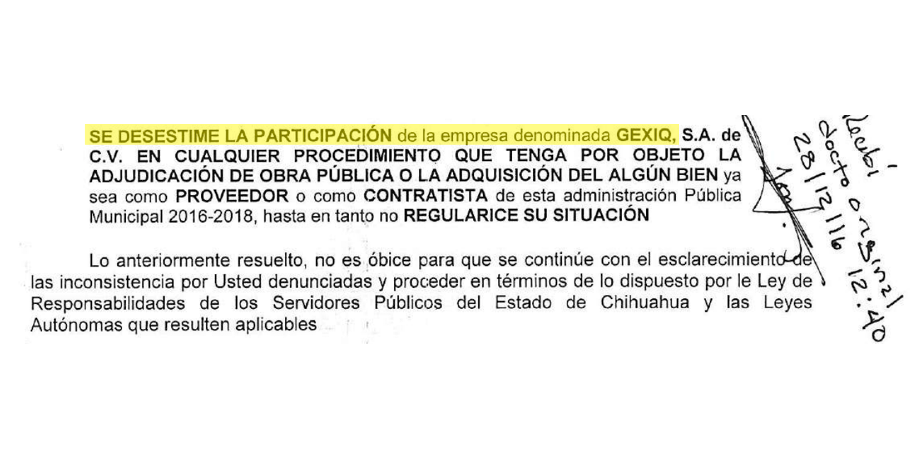 En diciembre de 2016, apenas dos meses después del inicio de la primera administración de Armando Cabada Alvídrez, la Contraloría Municipal, entonces a cargo de Flor Karina Cueva Vásquez, emitió un oficio en el que recomendó a los comités municipales relacionados con licitaciones y adquisiciones desestimar la participación de Gexiq “en cualquier procedimiento que tenga por objeto la adjudicación de obra pública o la adquisición de algún bien”.