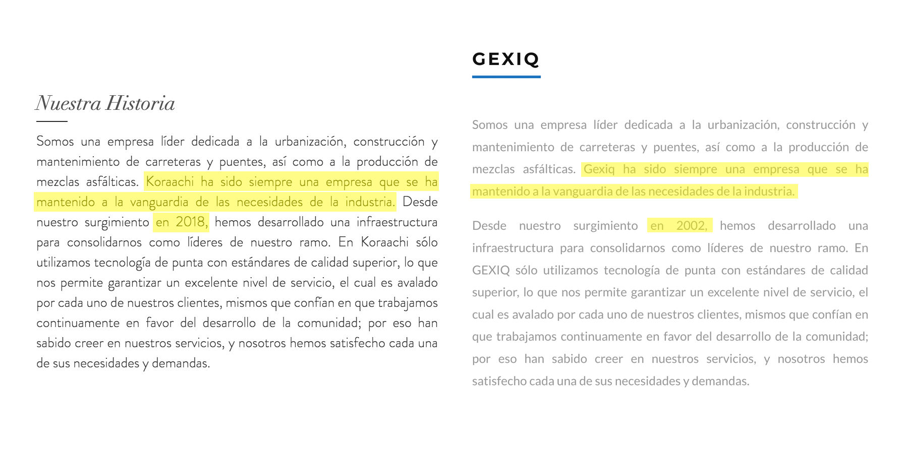 Los textos de las secciones ‘Nosotros’ en la página de Gexiq y ‘Nuestra Historia’ en la de Koraachi son casi iguales: solo cambia el nombre de la empresa y el año en el que fueron constituidas.