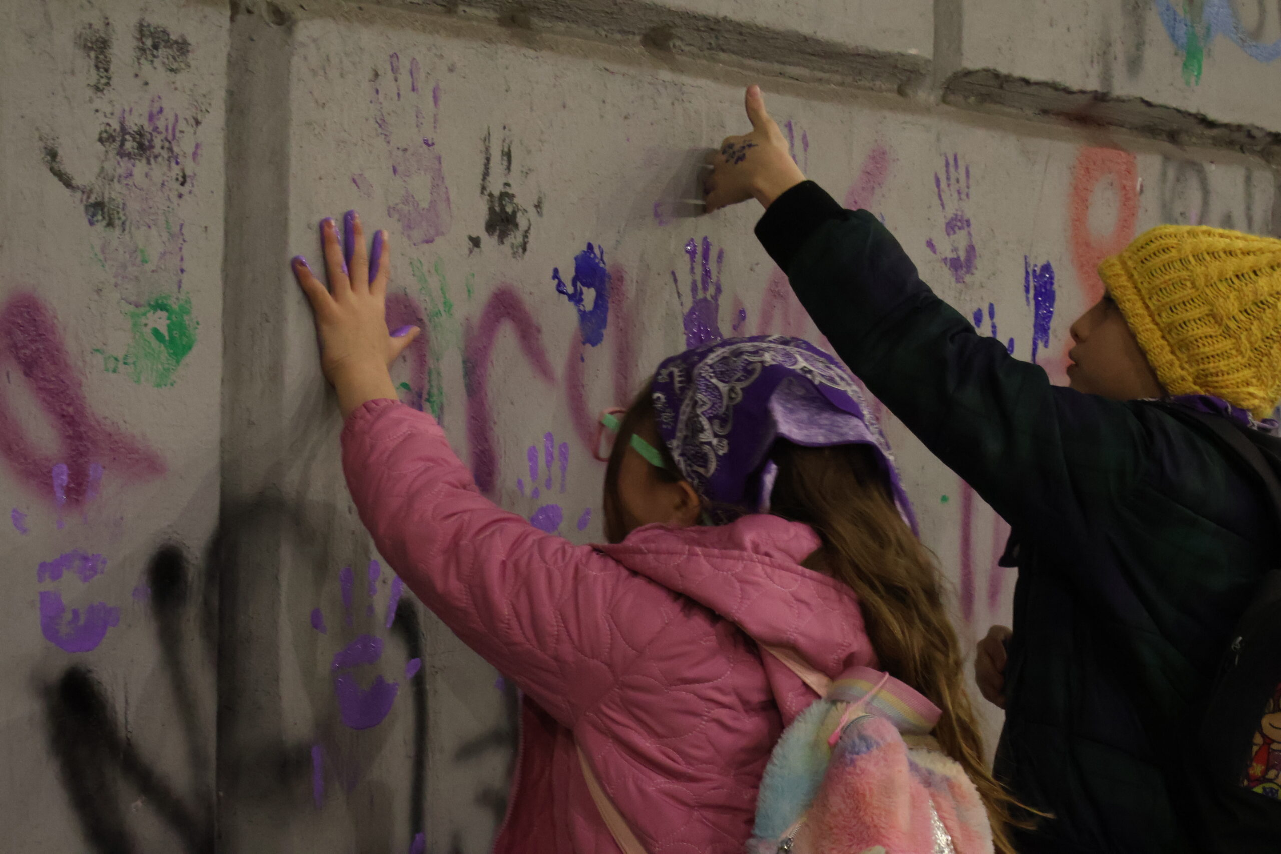 Al transitar por el túnel vehicular de la Av. 16 de Septiembre, el contingente plasmó con aerosol el nombre de sus agresores y denuncias contra el gobierno. También se hicieron pintas con las consignas “aborto legal”, “ni una más”, “con las niñas no”, “es tu lucha”. Además marcaron en las paredes las palmas de las manos con pintura morada, negra verde y rosa, intervención a la se sumaron decenas de infancias.