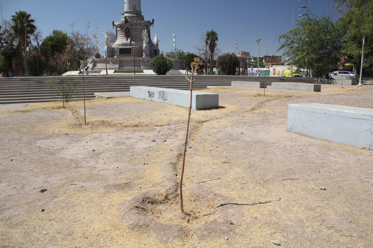 Ciudad Juárez, Chihuahua.— El 26 de septiembre de 2018, el colectivo ‘Arboles en Resistencia’ y otros colectivos derechohumanistas plantaron 43 árboles en el Monumento a Benito Juárez, en conmemoración a los 43 estudiantes de la Normal Rural Isidro Burgos de Ayotzinapa, que en ese entonces cumplían cuatro años desaparecidos. Ahora, dos años después de la siembra, solo quedan ramas secas de árboles que notoriamente han pasado mucho tiempo sin ser regados; hecho confirmado por el integrante del colectivo, Jorginhio Guerra.