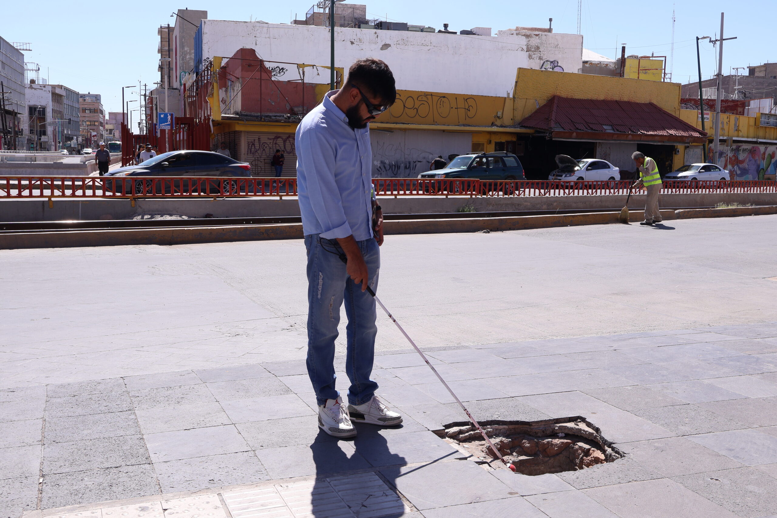 El recorrido con Eduardo comenzó en las letras ‘Ciudad Juárez’, sobre el corredor peatonal de la avenida 16 de septiembre, y a poco metros de caminar la guía se cortó para continuar metros más adelante. Eduardo explica que los mosaicos que le faltan pueden provocar confusión y accidentes.
