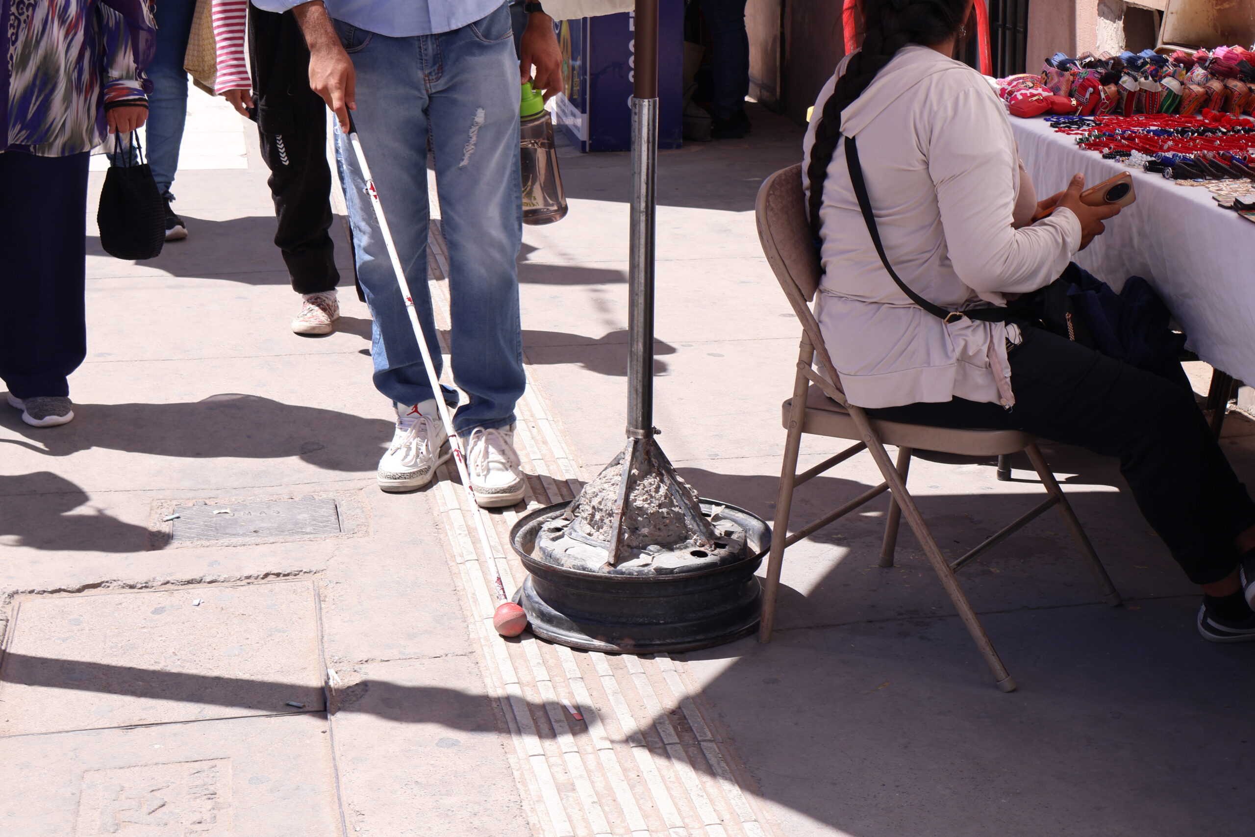 El equipo de YoCiudadano acompañó a Eduardo en un recorrido por el Centro Histórico y pudo constatar el avanzado estado de deterioro y abandono de la guía podotáctil, que luce dañada e incompleta en varios tramos, y en otros está obstruida por comerciantes que desconocen para qué sirve.