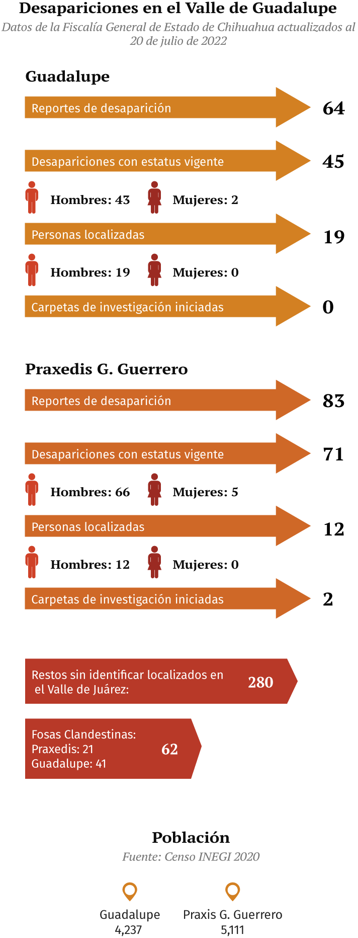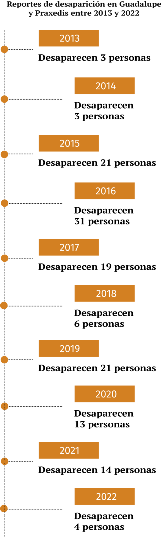 Al día de hoy la Fiscalía General del Estado mantiene una búsqueda de 71 personas desaparecidas solo en el Municipio de Praxedis, y de otras 45 personas en el Municipio de Guadalupe, de acuerdo con información entregada a través de la Plataforma Nacional de Transparencia. De estos casos solo 7 son mujeres y 109 son hombres.
