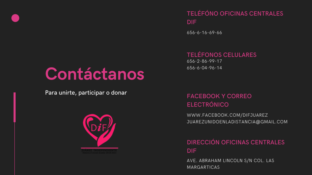 Ciudad Juárez, Chihuahua.— El DIF Municipal lanzó una campaña de donativos con la que buscan adquirir pruebas rápidas para las personas en condiciones vulnerables que habitan en la ciudad. La campaña llamada “Juárez unido en la distancia” tiene el objetivo de detectar posibles casos de COVID-19 en las personas que no tienen los recursos para hacerse pruebas rápidas. En un lapso de 15 días el DIF deberá recaudar todos los fondos posibles para poder hacer la compra de pruebas, por ello informaron que las personas interesadas en apoyar podrán hacer donativos económicos o en especie. Para las donaciones económicas proporcionaron la cuenta Banamex a nombre de Sistema para el Desarrollo Integral de la Familia del Municipio de Juárez, cuya CLABE interbancaria es 00 21 64 70 09 75 13 45 59 y la cuenta en ventanilla es 7513455. Además invitaron a la ciudadanía a compartir la campaña en redes sociales para que llegue a más personas y se logre obtener mayores donaciones. Quienes requieran mayor información pueden comunicarse al teléfono de las oficinas centrales del DIF (656) 616-6966 o a los celulares (656) 286-9917 y (656) 604-9614. También pueden contactar al DIF a través del correo juarezunidoenladistancia@gmail.com o en la página oficial de Facebook DIF Juárez.