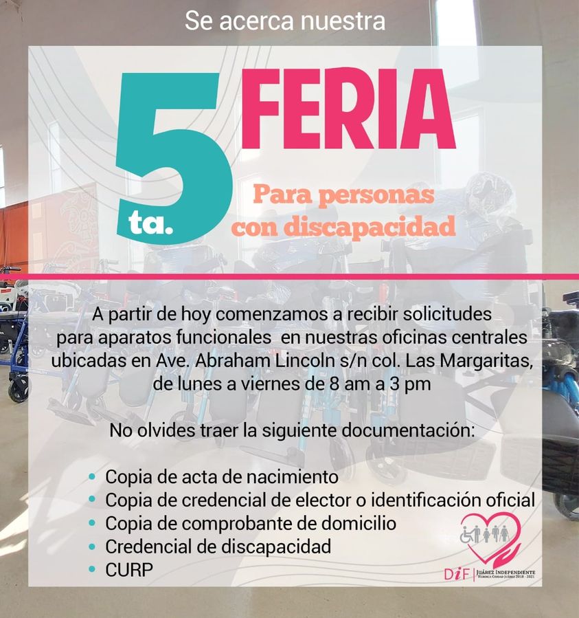 Ciudad Juárez, Chihuahua.— El DIF Municipal informó que ya se encuentra abierto el registro para quienes deseen recibir diferentes tipos de apoyos durante la 5ta Feria para Personas con Discapacidad. Aunque todavía no han anunciado la fecha en la que se llevará a cabo el evento, la directora general del DIF, María Reyes López, mencionó que las personas que se registren podrán obtener de forma gratuita sillas de ruedas, andadores y bastones. Para realizar el registro deben acudir de lunes a viernes, en un horario de 8:00 de la mañana a 3:00 de la tarde, a las oficinas centrales del DIF, ubicadas en la avenida Abraham Lincoln, en la colonia Margaritas. Además se tendrán que presentar los siguientes documentos de la persona con discapacidad para que pueda ser beneficiaria del programa: copia de acta de nacimiento, copia de credencial de elector o identificación oficial, CURP, copia de comprobante de domicilio y la credencial de discapacidad. Si desean mayor información deben comunicarse al teléfono del DIF 656-613-8141 extensión 209. El pasado 27 y 28 de marzo se llevó a cabo la 4ta Feria para Personas con Discapacidad. También se ofrecieron servicios médicos a través de las diversas unidades médicas móviles pediátricas y geriátricas que tiene el Municipio.
