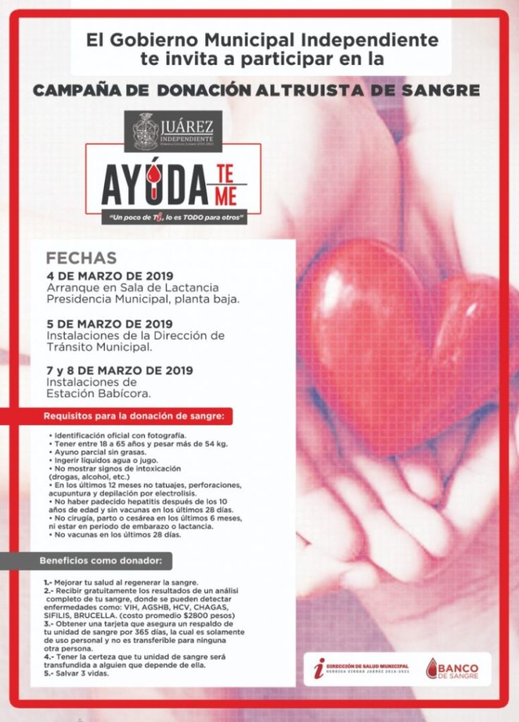 Ciudad Juárez, Chihuahua.— El 4 a de marzo iniciará la ‘campaña altruista’ de donación de sangre, organizada por la Dirección de Salud, informó la directora de la misma, Daphne Santana. Con el fin de promover la cultura de la donación de sangre, la campaña utiliza el eslogan: “Un poco de ti, lo es todo para otros”. Ya que además de ayudar a las personas que necesitan sangre, los donadores reciben beneficios. De acuerdo con Santana, la donación “mejora la salud al regenerar la sangre”, así como la oportunidad de “recibir gratuitamente resultados de análisis completos para detectar diversos tipos de enfermedades”. El primer día de la campaña, el equipo de la Dirección de Salud se encontrará en la Dirección de Derechos Humanos, ubicado en la planta baja de la Unidad Administrativa “Benito Juárez”, mientras que el 5 de marzo, se concentrarán en las instalaciones de la Dirección de Tránsito, encontradas en el bulevar Teófilo Borunda, casi esquina con el bulevar Óscar Flores. Finalmente, los últimos dos días de la campaña altruista de donación de sangre, el 7 y 8 del mismo mes, estarán en las instalaciones de la Estación Distrito Sur, conocida como Babicora. La directora de Salud invitó a toda la ciudadanía mayor de 18 años y menor de 65, a participar en la donación, por lo que los interesados deberán presentarse con una identificación oficial con fotografía, en ayuno parcial sin grasas y tener un peso de más de 45 kilos. Los donadores, también deberán cumplir con los siguientes requisitos: “ingerir líquidos agua o jugo, no mostrar signos de intoxicación por drogas o alcohol, no haberse tatuado, perforaciones, acupuntura y depilación por electrólisis en los últimos 12 meses. No haber padecido hepatitis después de los 10 años de edad y sin vacunas en los últimos 28 días. No cirugía, parto o cesárea en los últimos 6 meses ni estar en periodo de embarazo o lactancia”, explicó Santana. A la ciudadanía le aseguró que la unidad de sangre que donen, será transfundida a alguien que realmente la necesite.