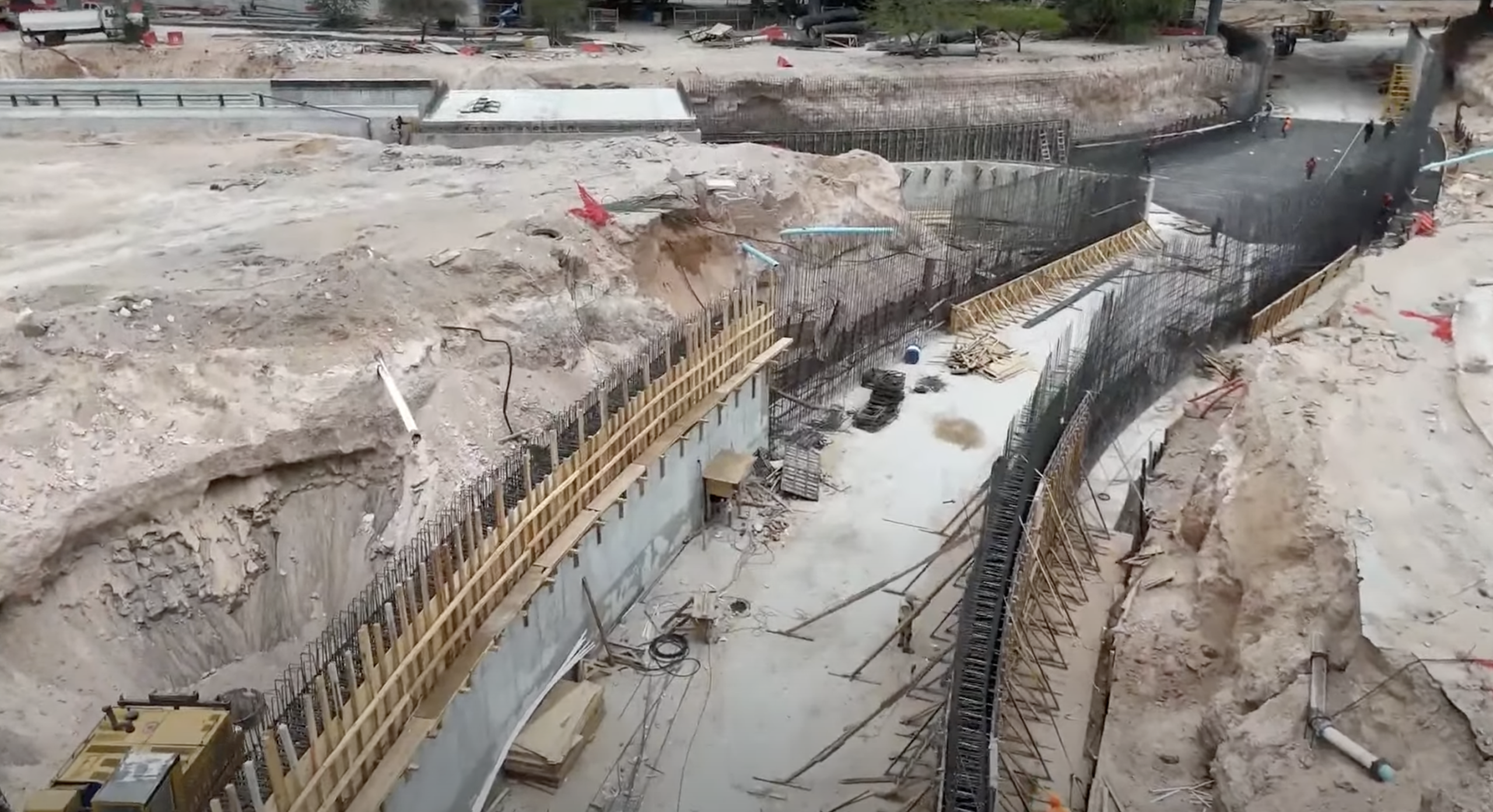 También se trabaja en la colocación de acero de refuerzo en muros, pavimento e instalación de pilastras y barandal en parapetos, así como en la pavimentación en laterales del bulevar Independencia y Talamás.