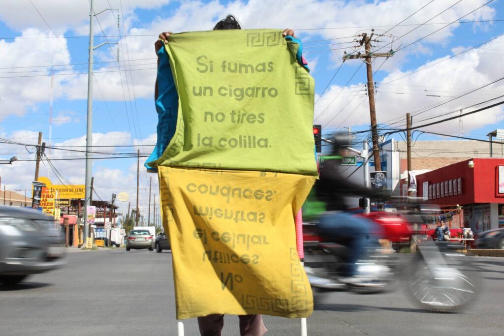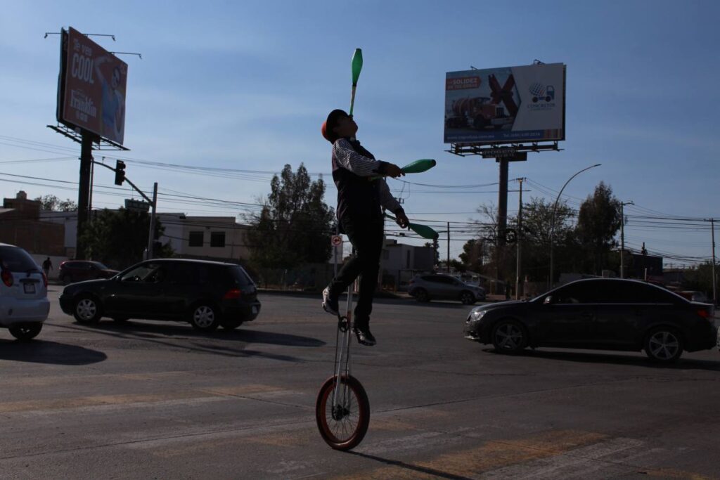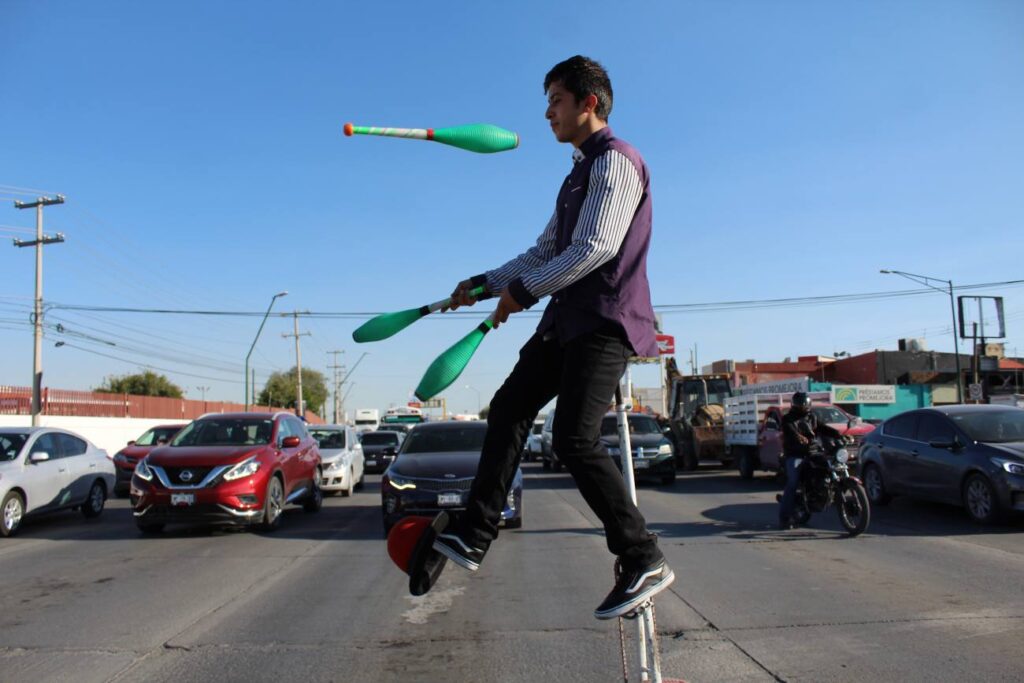 Ciudad Juárez, Chihuahua.— Cuando las luces cambian a rojo, los artistas de semáforo aprovechan al máximo los segundos para presentar un acto entretenido y hacer más ligera la espera de los conductores. Cada artista usa distintas herramientas para atrapar la atención de sus espectadores: algunos se caracterizan de payaso, otros tocan algún instrumento, e incluso hay quienes exhiben mensajes de concientización, acompañados de malabares. Fernando García López, conocido como ‘Balam’, es un viajero de la Ciudad de México que trabaja desde hace nueve años en los semáforos: “Lo hago porque me gusta, tengo una libertad que no tengo en otro trabajo. Además pongo mis mensajes de conciencia porque se necesitan en un país donde hay tantas problemáticas”.
