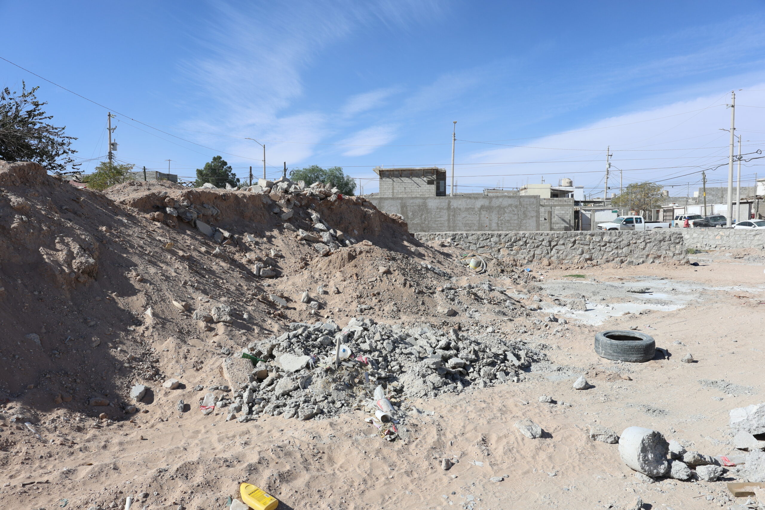 Los trabajos del ‘Teatro al Aire Libre’– un proyecto ganador del Presupuesto Participativo de 2023– están abandonados, inconclusos, con agua estancada, escombro y montañas de tierra. Los trabajos fueron asignados por el gobierno municipal a una empresa ligada a un funcionario del gobierno del estado de Chihuahua.