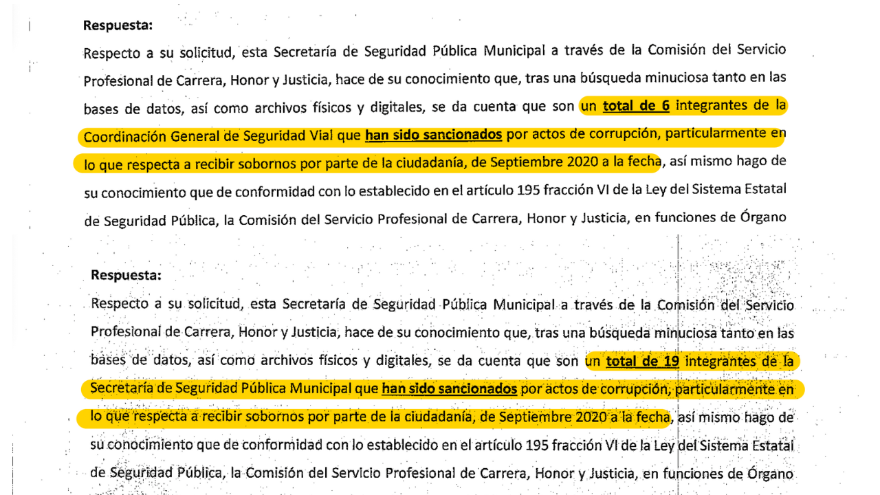 A través de solicitudes de acceso a la información – 080155924000627 y 080155924000628–, la Comisión del Servicio Profesional de Carrera, Honor y Justicia de la Secretaría de Seguridad Pública Municipal (SSPM) reportó que dichos elementos fueron investigados y sancionados por incurrir en este tipo de actos de corrupción.