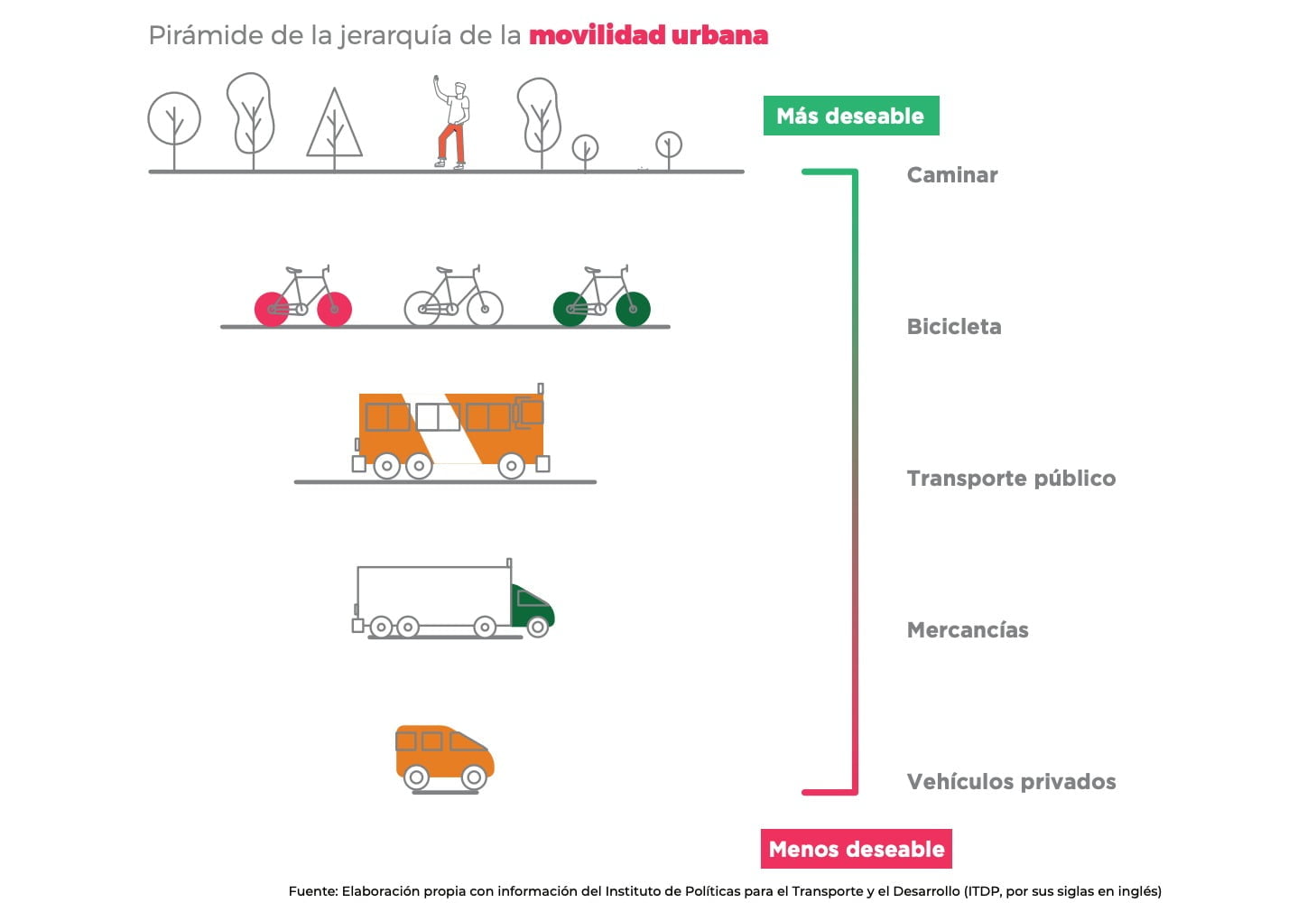 La misma ley en su Artículo 6 establece la Jerarquía de la Movilidad, que garantiza y beneficia en todo momento el desplazamiento de la ciudadanía, colocando en prioridad a las personas peatonas y a las personas con discapacidad o con movilidad limitada, y en segundo lugar a los ciclistas y usuarios de vehículos no motorizados. Mientras que al final de la pirámide se encuentran los vehículos particulares.