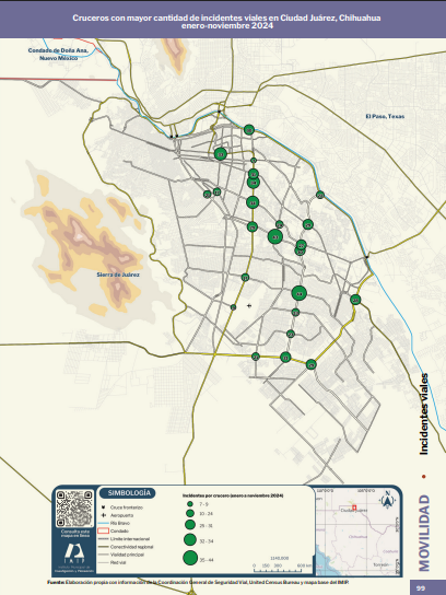 De acuerdo con la Radiografía Socioeconómica del Municipio de Juárez 2024 del IMIP, los cruceros con mayor cantidad de siniestros viales durante enero a noviembre de 2024, fueron las intersecciones entre el bulevar Zaragoza y la avenida de las torres con 44 siniestros, le sigue el cruce entre la avenida Paseo de la Victoria y Teófilo Borunda con 43 incidentes; en la lista también figuran la avenida Tecnológico con la Ejército Nacional, así como el cruce de Las Torres con el bulevar Talamás Camandari.