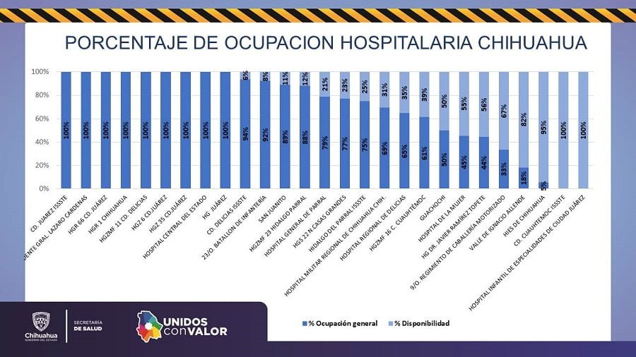 Ciudad Juárez, Chihuahua.— La Secretaría de Salud informó hoy que en el transcurso de las últimas 24 horas el estado de Chihuahua sumó 649 nuevos casos de COVID-19, así como 30 defunciones. En total, el estado acumula 26 mil 850 contagios confirmados y 2 mil 056 muertes a causa de la enfermedad, que en los últimos días se ha intensificado en la entidad. En cuanto al municipio de Juárez, el más golpeado por la pandemia, se llegó a 14 mil 751 casos confirmados, luego de que se sumaran 542 en el último día. La directora de Prevención y Control de Enfermedades, Leticia Ruiz González, dijo que el numero de hospitalizaciones continúa a la alza, con 998 pacientes, de los cuales 164 están intubados. El reporte indica que en los 27 hospitales COVID del estado, el 62 por ciento de los pacientes son atendidos en el IMSS, 22 por ciento en el Sector Salud, 9 por ciento en el ISSSTE, 6 por ciento en la Sedena y 1 por ciento en el IMSS Bienestar. De acuerdo con la gráfica de ocupación, nueve hospitales están al 100 por ciento, cuatro por encima del 80 por ciento, seis con menos del 40 por ciento de camas disponibles y ocho con más de la mitad de su capacidad.