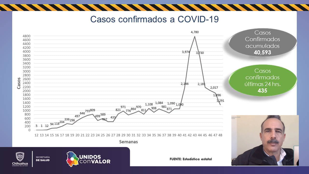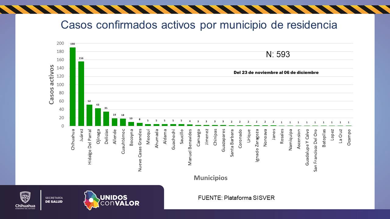 Asimismo indicó que hay 593 casos activos en el estado, de los cuales 190 pertenecen a la ciudad de Chihuahua y 156 a Juárez.