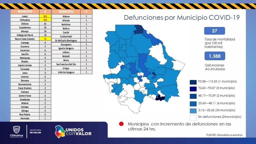 Los casos positivos acumulados por municipio son: Ahumada 11, Aldama 27, Allende 8, Ascensión 47, Aquiles Serdán 127, Bachíniva 9, Batopilas 5, Bocoyna 135, Balleza 2, Buenaventura 8, Camargo 93, Carichí 3, Casas Grandes 7, Chihuahua 4 mil 046, Chínipas 32, Coronado 3, Cuauhtémoc 749, Cusihuiriachi 7, Delicias 796, Dr. Belisario Domínguez 2, Galeana 4, Gómez Farías 61, Guachochi 56, Gran Morelos 7, Guadalupe 5, Guadalupe y Calvo 9, Guazapares 27 y Guerrero 28. Hidalgo del Parral 510, Ignacio Zaragoza 2, Janos 15, Jiménez 78, Juárez 7 mil 489, Julimes 6, López 3, Madera 20, Manuel Benavides 17, Matachí 1, Meoqui 154, Moris 2, Namiquipa 41, Nuevo Casas Grandes 194, Ocampo 6, Ojinaga 289, Praxedis G. Guerrero 8, Riva Palacio 5, Rosales 29, San Francisco del Oro 3, Santa Bárbara 10, Satevó 4, Saucillo 55, Temósachic 4, Urique 16, Valle de Zaragoza 3, San Francisco de Conchos 14, Santa Isabel 2, La Cruz 2, San Francisco de Borja 3, Maguarichi 1, Nonoava 1 y El Tule 1 (se agrega). Respecto al número de personas fallecidas por municipio de residencia: Juárez acumula 863, Chihuahua llegó a 268, Delicias 61, Cuauhtémoc 53, Meoqui 24, Parral 19, Nuevo Casas Grandes 16, Camargo nueve, Guerrero siete, Ascensión y Saucillo seis 2 son en Guadalupe D.B., 4 Rosales, 1 Bachíniva, 2 Buenaventura, 1 Ignacio Zaragoza, 1 San Francisco del Oro, 2 Madera, 3 Coronado, 2 Ojinaga, 1 Valle de Zaragoza, 2 Bocoyna, 1 Moris, 2 Gómez Farías, 3 Jiménez, 1 Urique, 2 Casas Grandes, 1 Allende, 3 Janos, 2 Galeana, 2 Ocampo, 3 Aquiles Serdán, 1 Balleza, 1 Matachí, 7 Guerrero, 4 Namiquipa, 2 Riva Palacio, 1 Julimes, 1 Guazapares, 1 Carichí, 1 Ahumada, 1 Cusihuiriachi, 1 Aldama y 1 Dr. Belisario Domínguez. Hasta el momento se tiene el reporte de 248 pacientes hospitalizados en el estado, de los que 61 se encuentran en estado grave intubado.