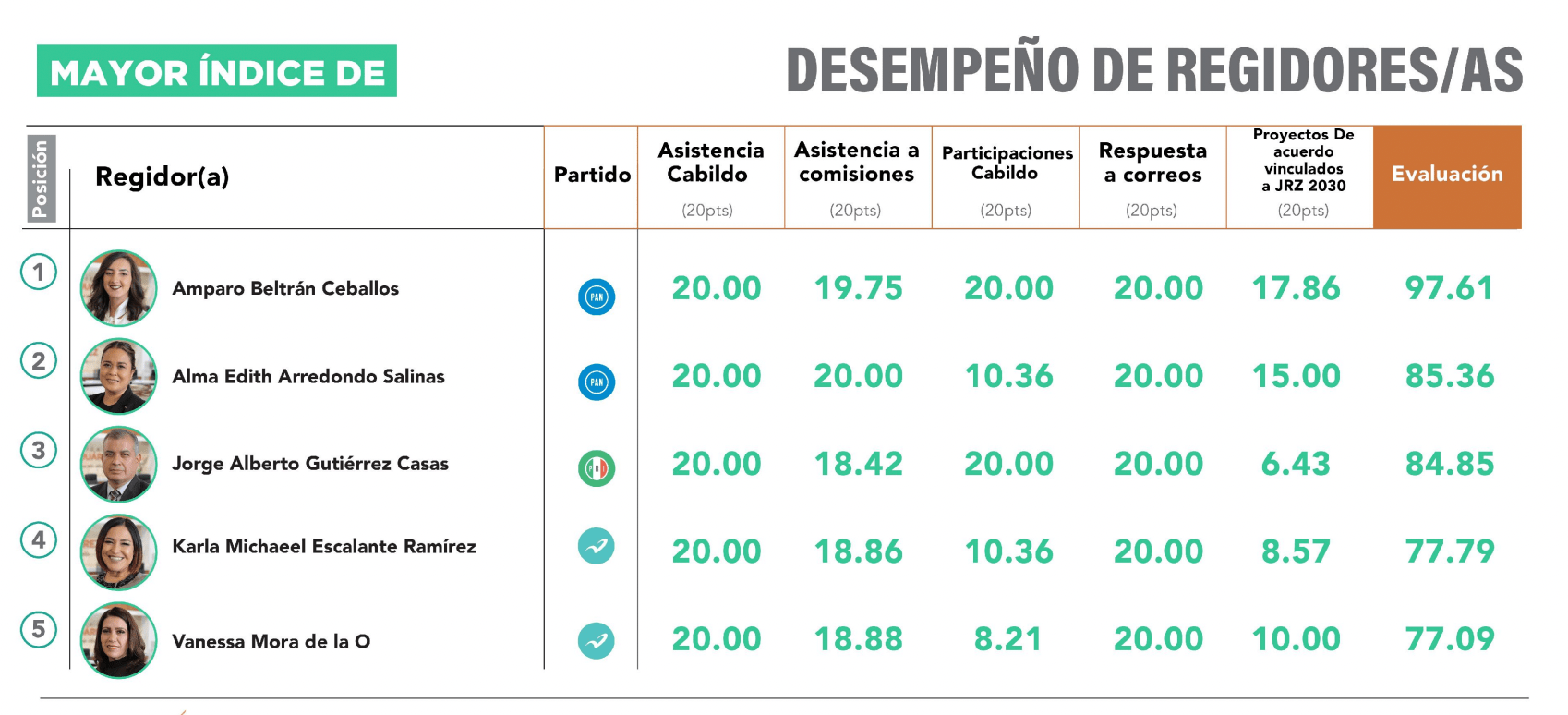 La regidora Amparo Beltrán Ceballos (PAN) fue la mejor calificada con una puntuación de 97.61 puntos, mientras que la regidora Mayra Karina Castillo Tapia (Morena) recibió la puntuación más baja, 42.65.
