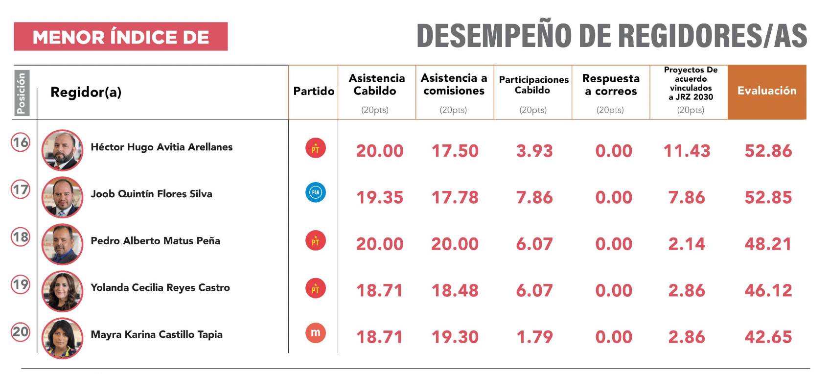 Cada criterio tiene una puntuación de 20 puntos, por lo que la calificación final es sobre 100 puntos, explicó Chacón Rodríguez. Durante el informe se presentaron a las y los cinco regidores con mejor y peor puntuación respectivamente.