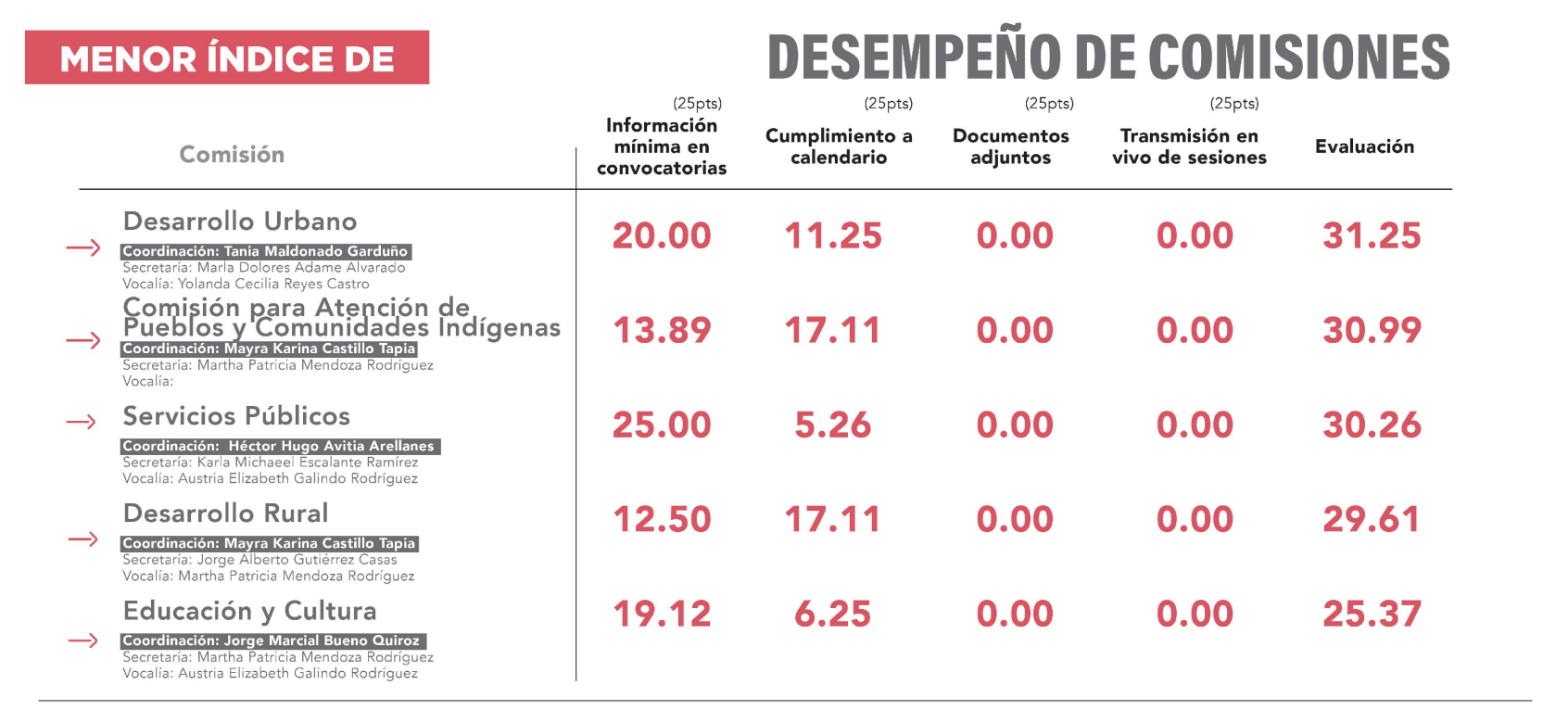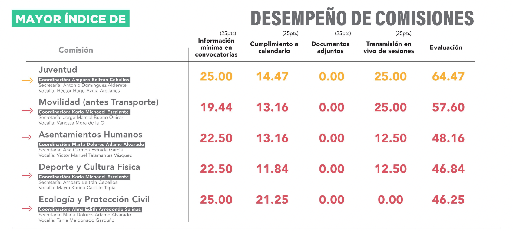 Además de evaluar a las y los regidores, la asociación civil también calificó el desempeño que han tenido hasta el momento las comisiones integradas por las y los regidores. En este caso, se tomaron en cuenta cuatro criterios que equivalen a 25 puntos en total cada uno, para dar un total de 100 puntos.
